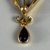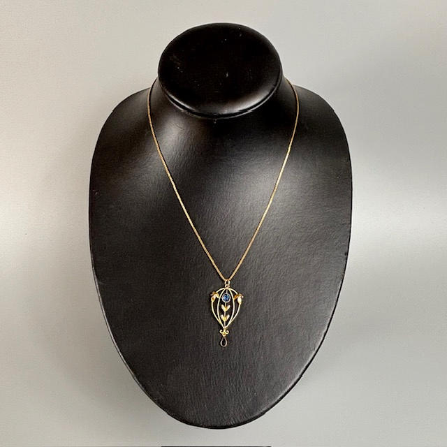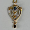 9ct Gold Victorian pendant tear drop shaped with blue coloured gemstones and foliate design on a box link Gold chain marked 333 (8k) total weight approx 4.1g.