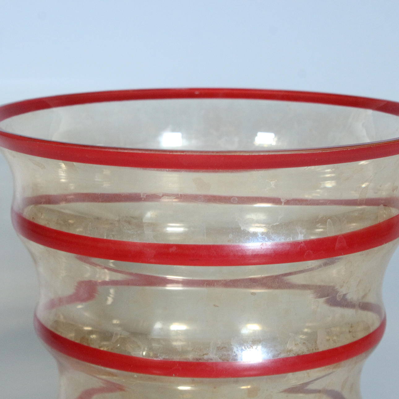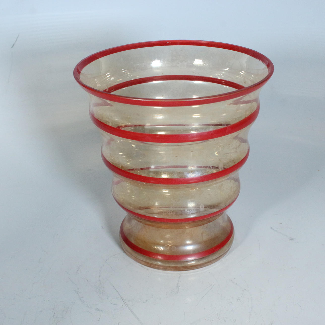 Art deco funnel vase. Orange-shaped glass vase with red borders.