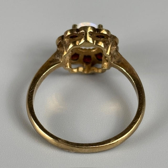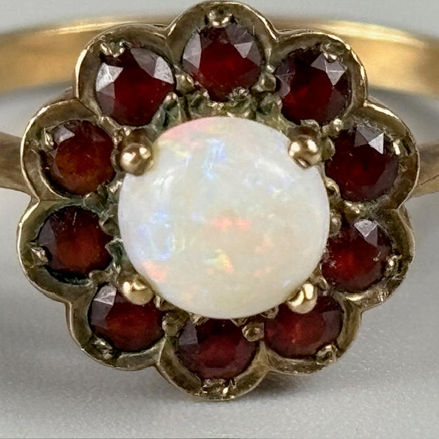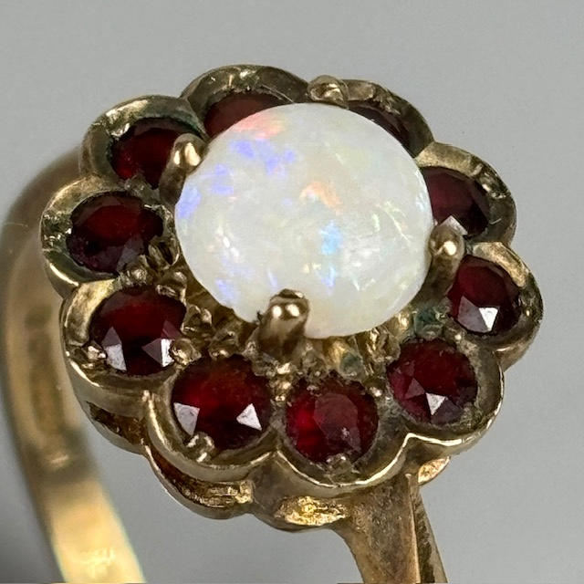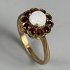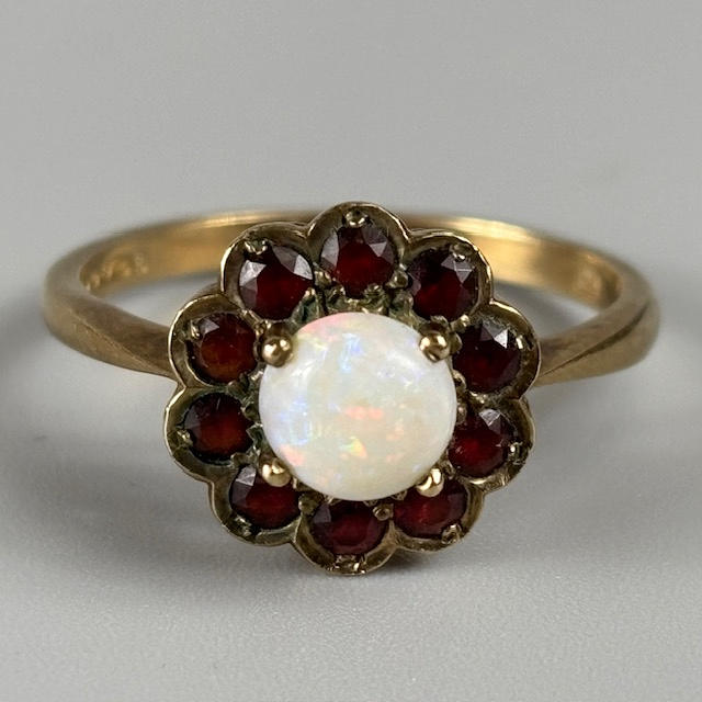 9ct yellow gold fully hallmarked daisy style vintage ring set with a central raised cabochon white Opal and surrounded by garnets size 'O'.