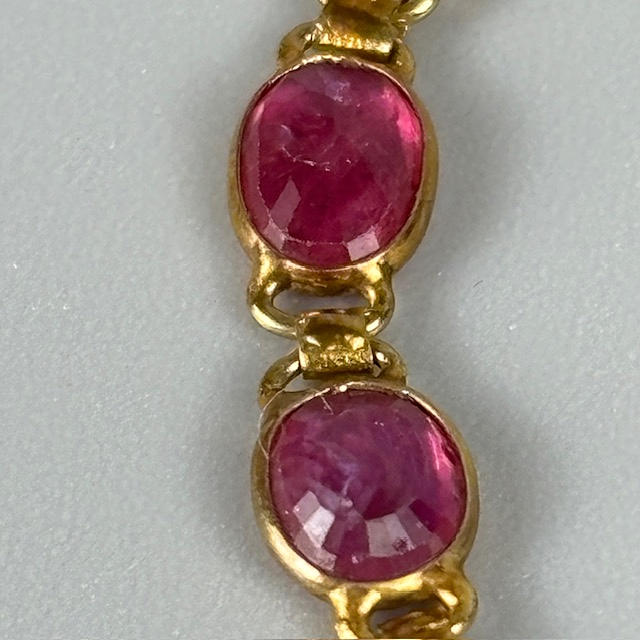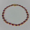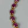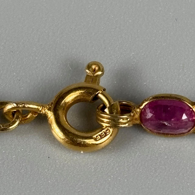 14ct stamped 585 gold bracelet set with pink oval gemstones (pink Sapphires), approx 18cm in length and boxed.