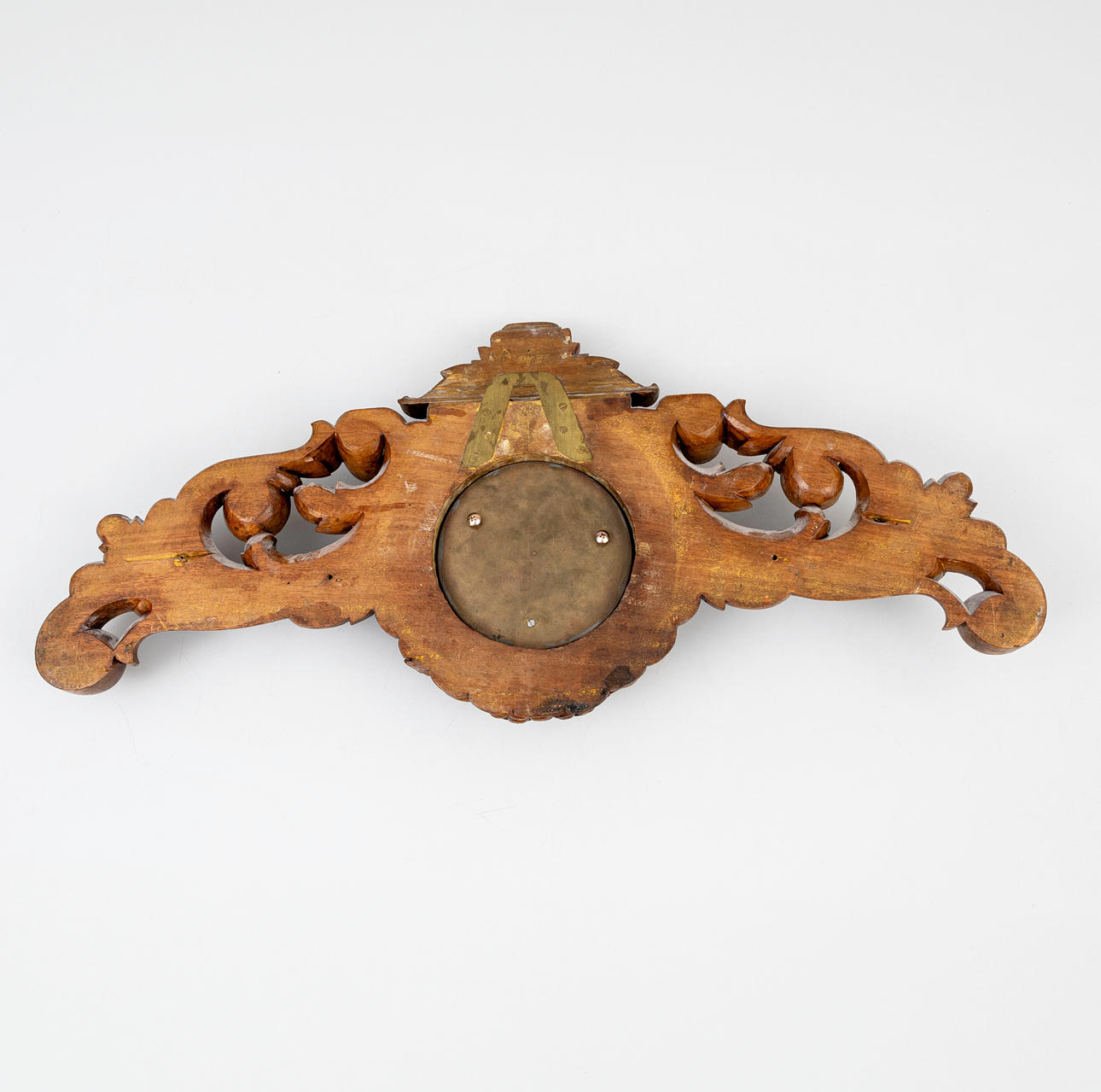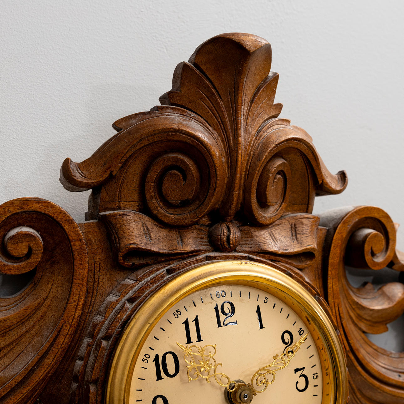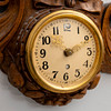 A carved wooden wall clock, circa 1900.