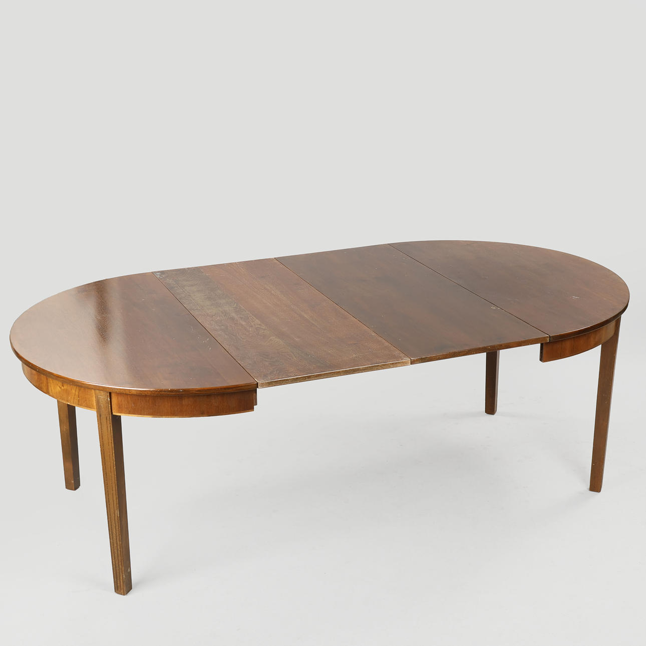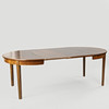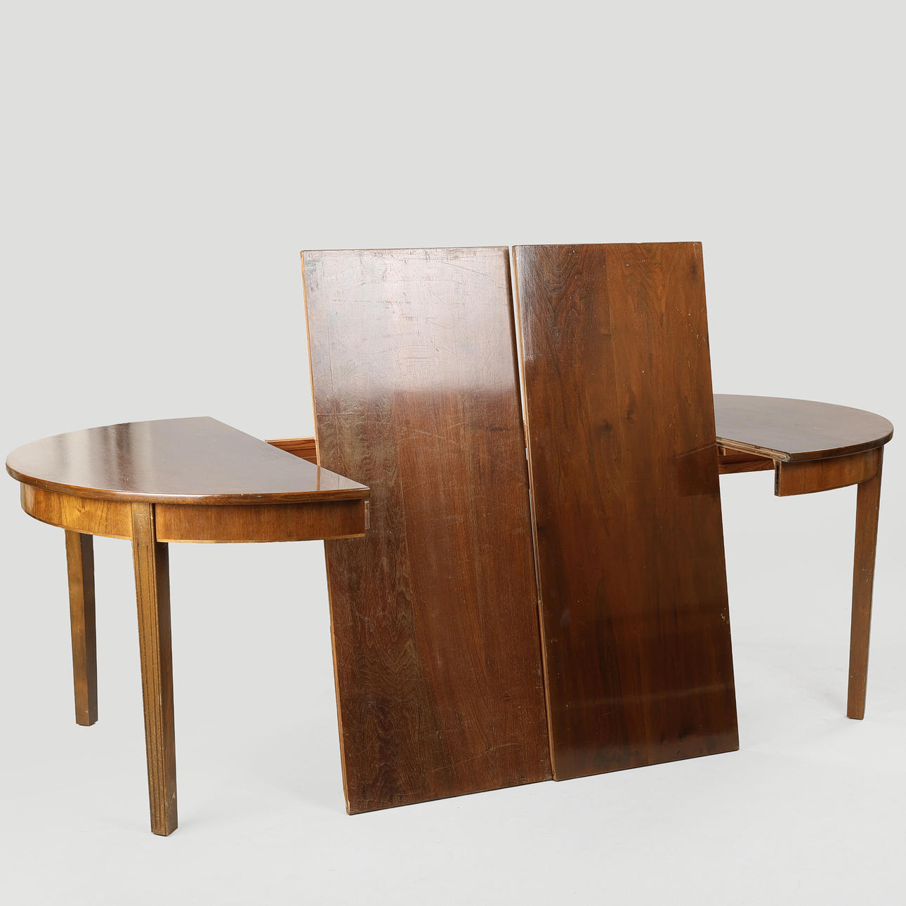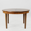 4979850. Circular dining table with veneered walnut wood top, stained beech legs, two additional plates, Denmark, mid 20th century, (1+2).