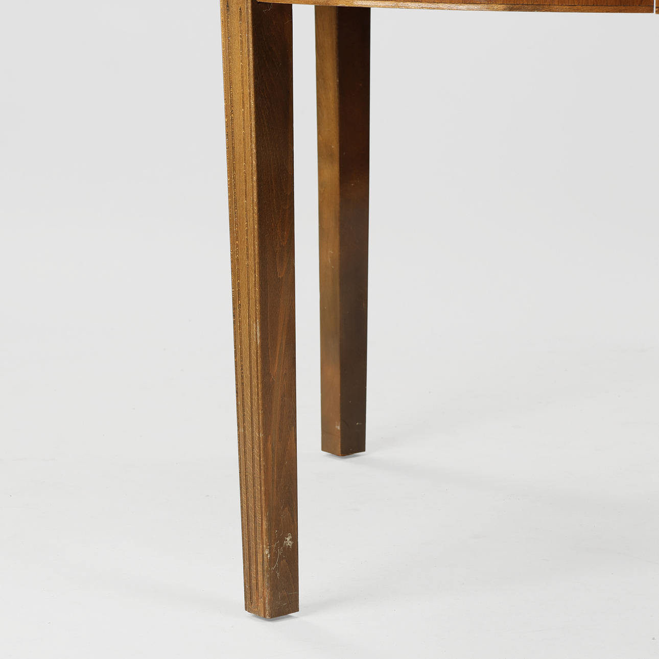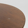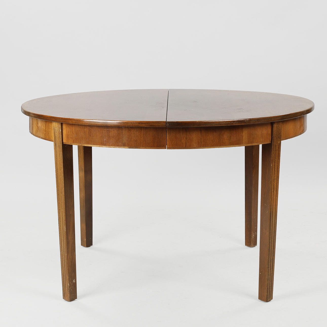 Circular dining table with plate of veneered walnut wood, legs of stained beech. Two additional plates included.