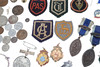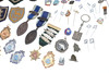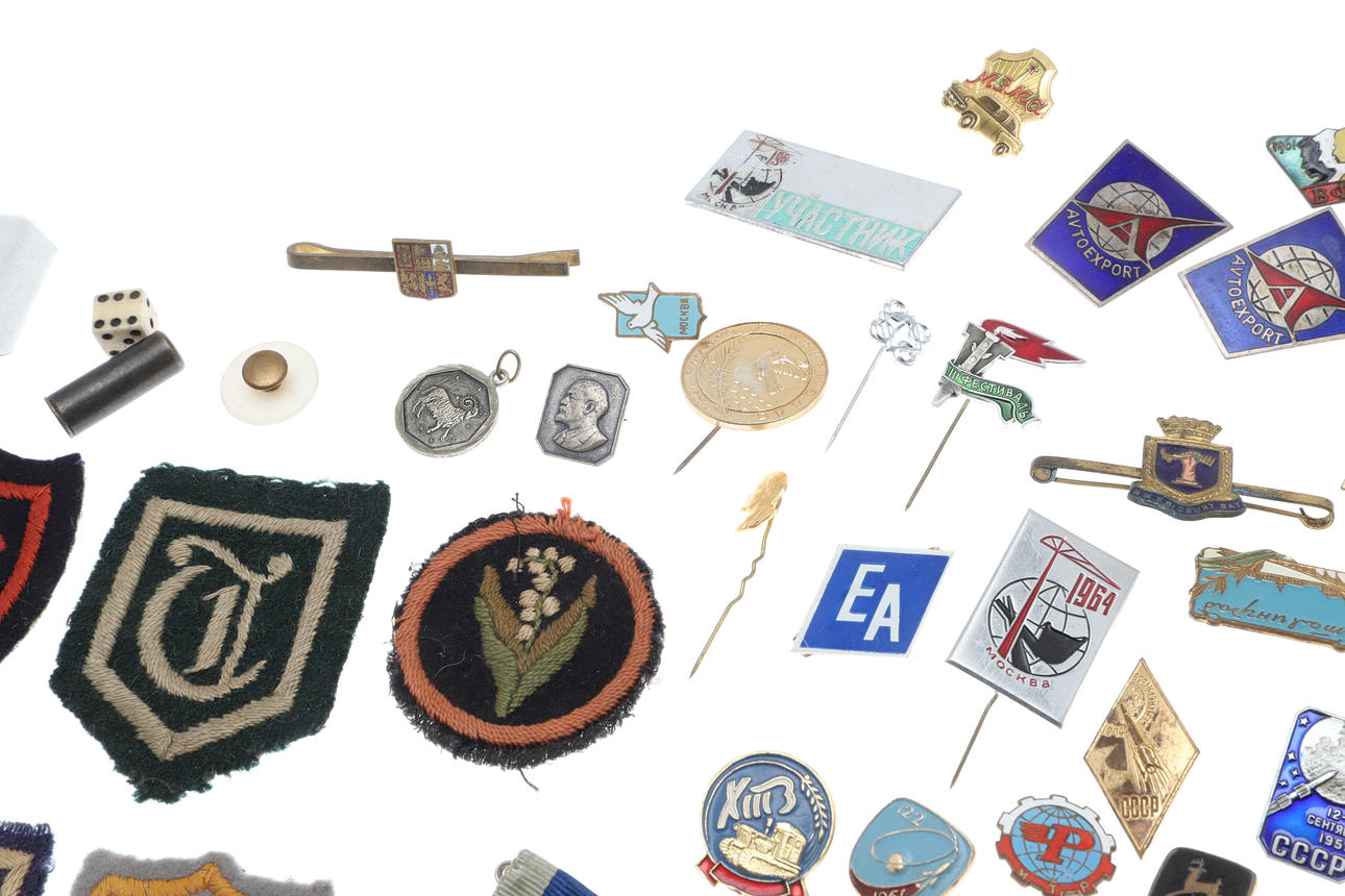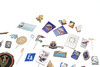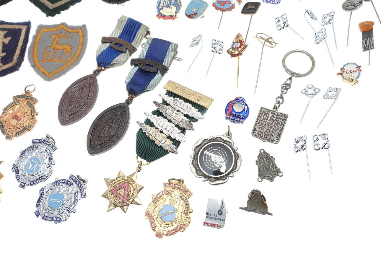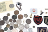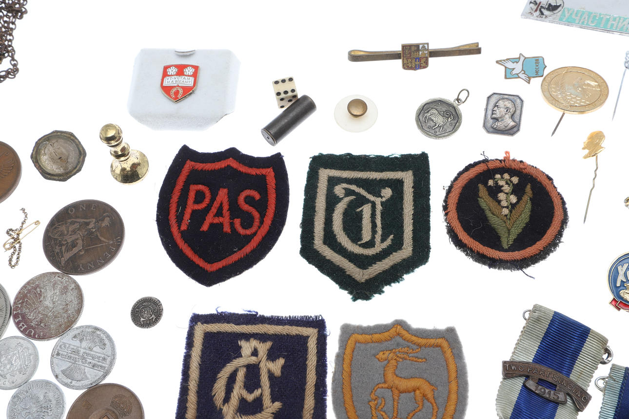 A mixed lot including various coinage (Franklin Mint medal, Decimal Set, loose coins etc), various metal and cloth badges, and a cased presentation key (Special School). Cased key 17cms by 8cms.
