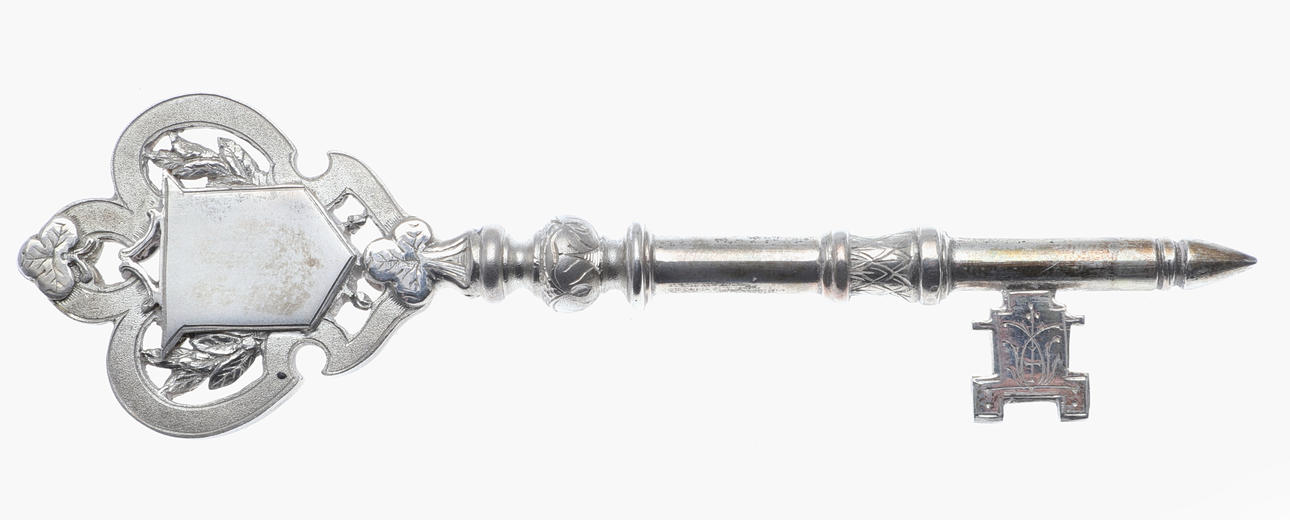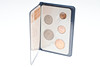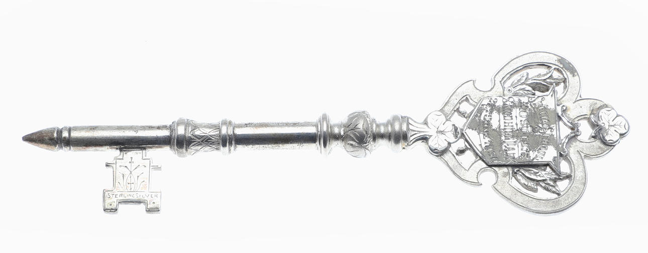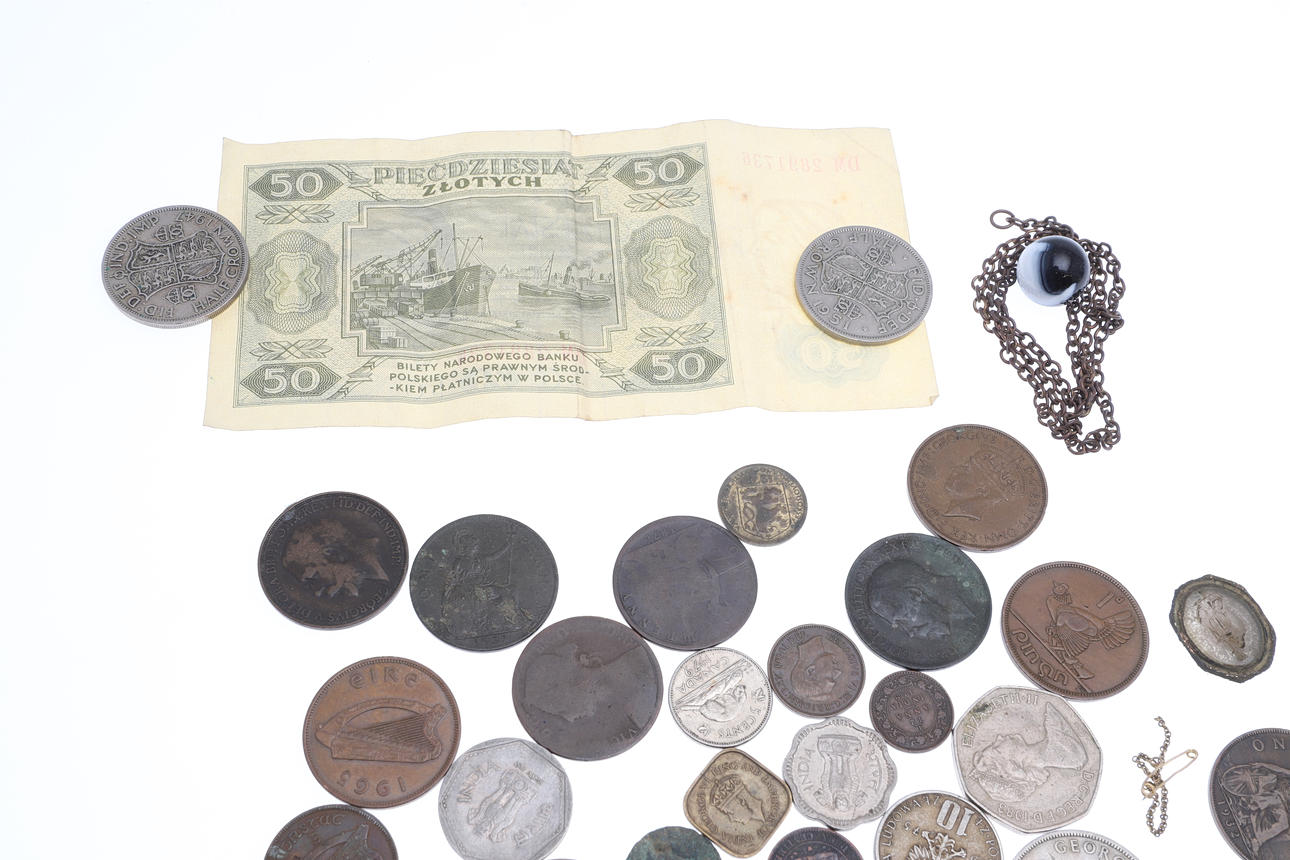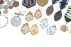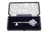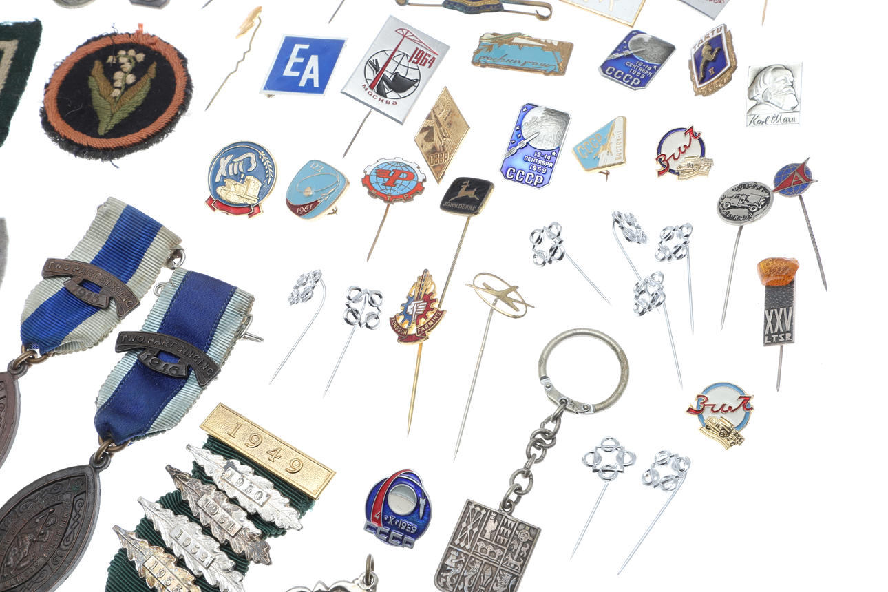 A mixed lot including various coinage (Franklin Mint medal, Decimal Set, loose coins etc), various metal and cloth badges, and a cased presentation key (Special School). Cased key 17cms by 8cms.