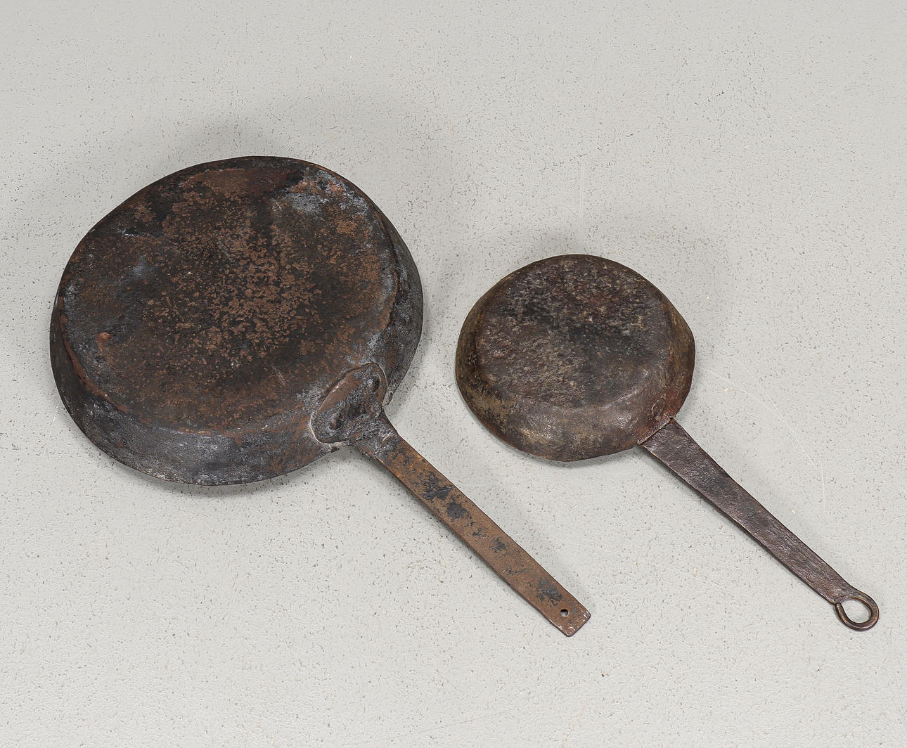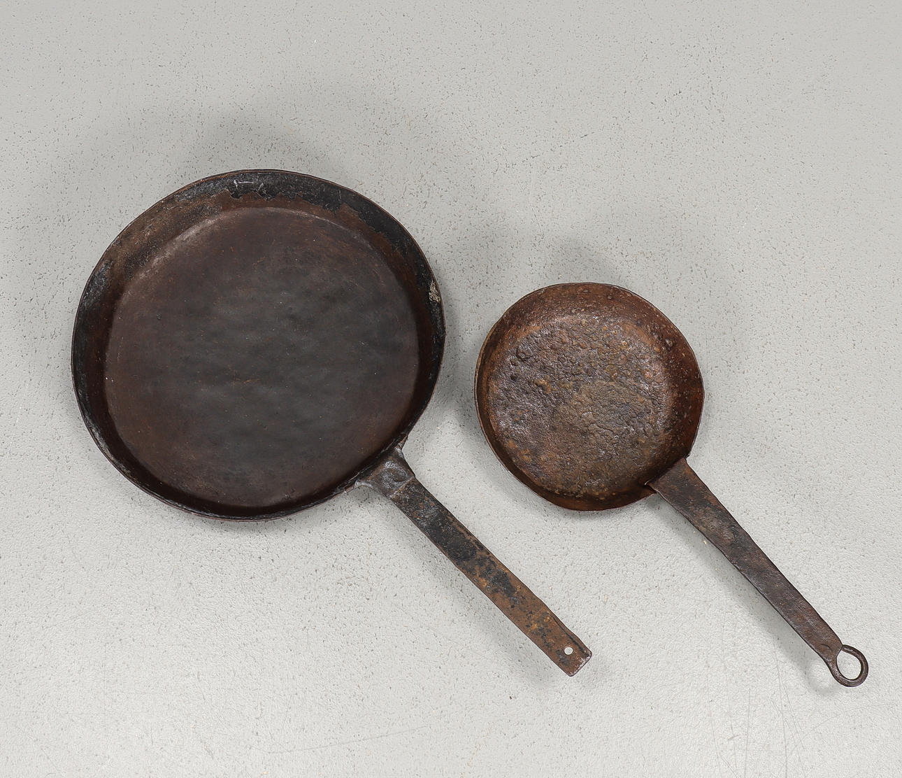 Two iron frying pans, 19th century.