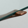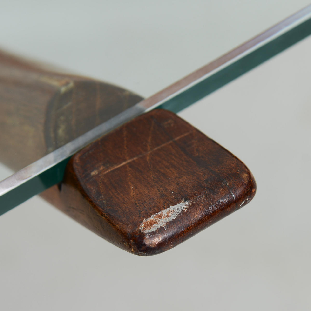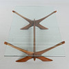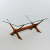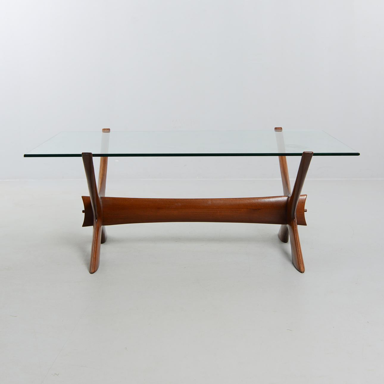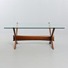 Teak and glass top. Length of glass top 136 cm. Width 86 cm. Height of frame 55 cm.