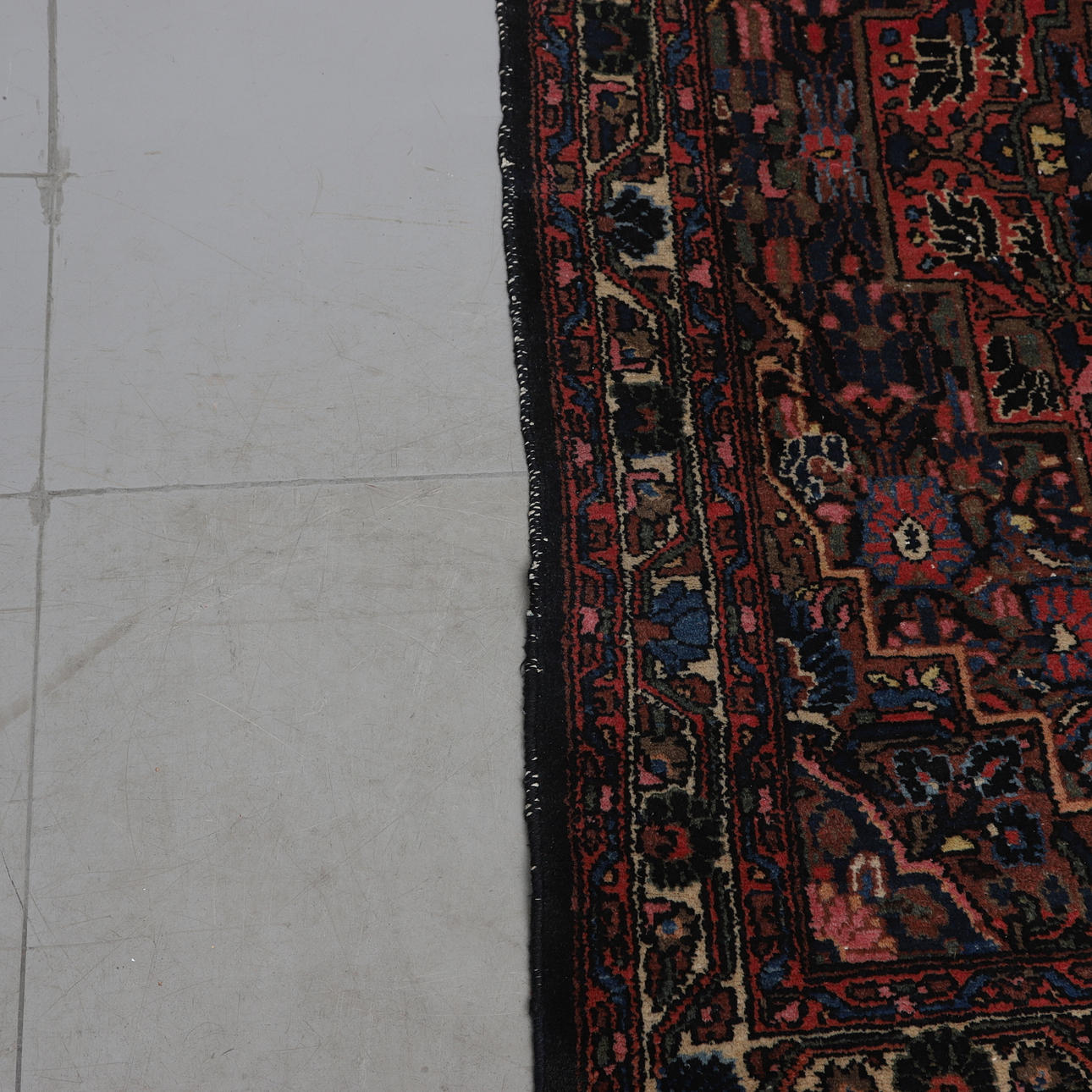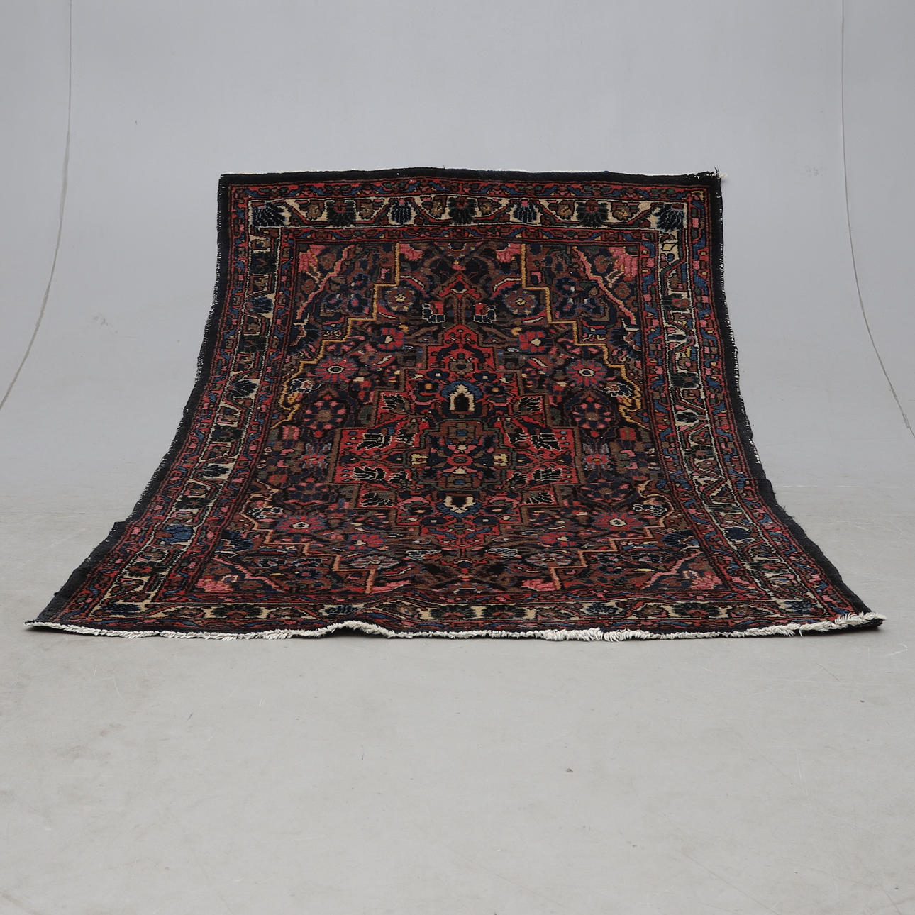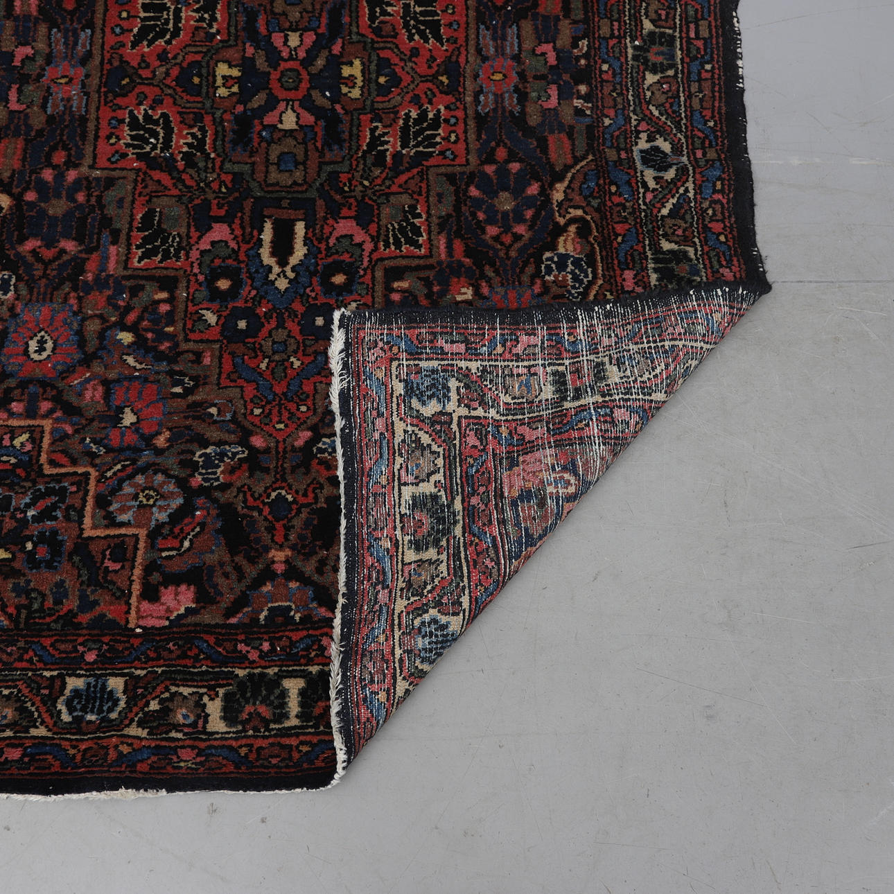 Wool on cotton wool. Dark bottom color with polychrome decor.