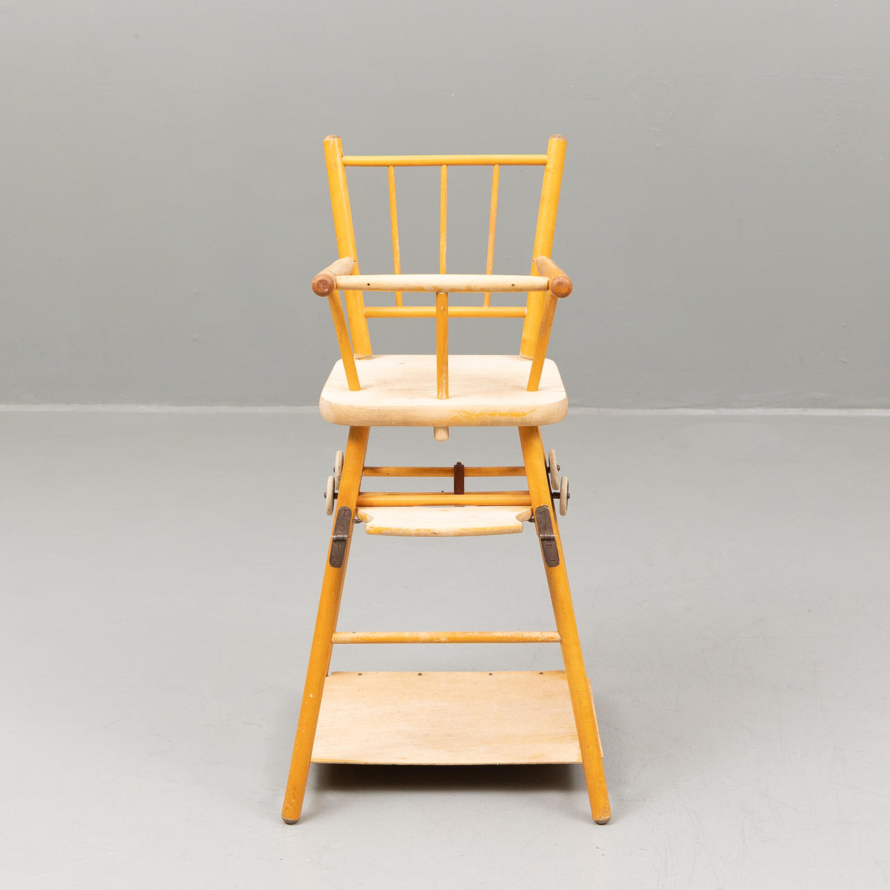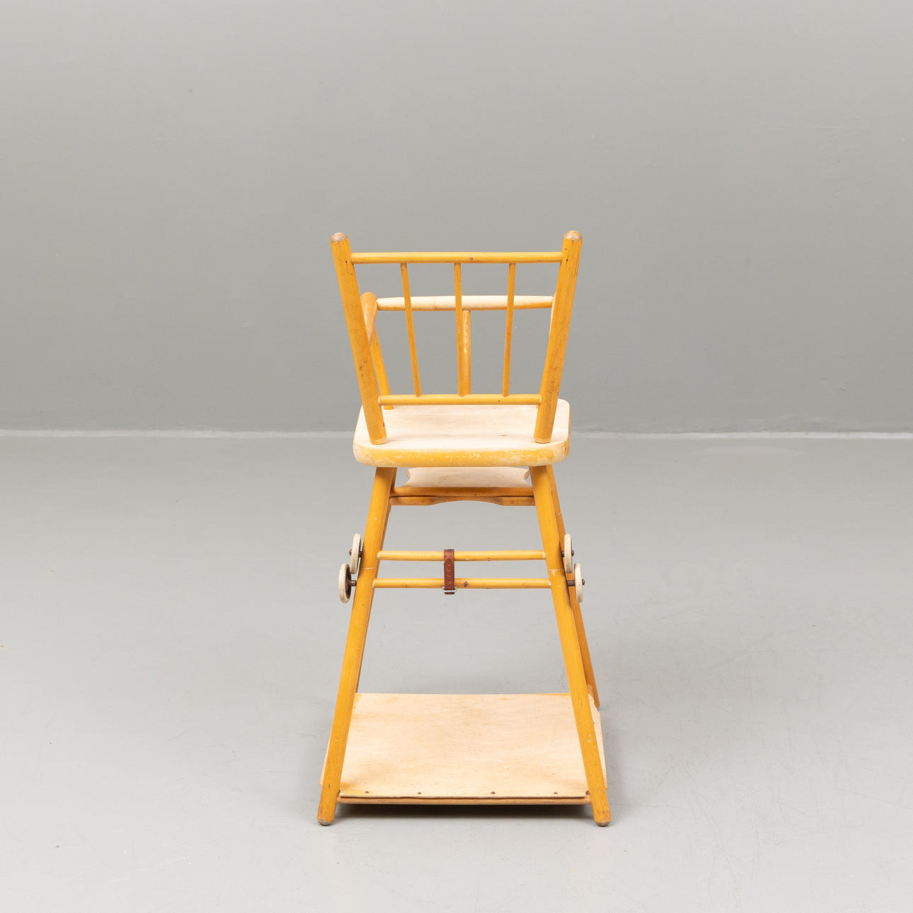 A mid 20th century foldable birch highchair.