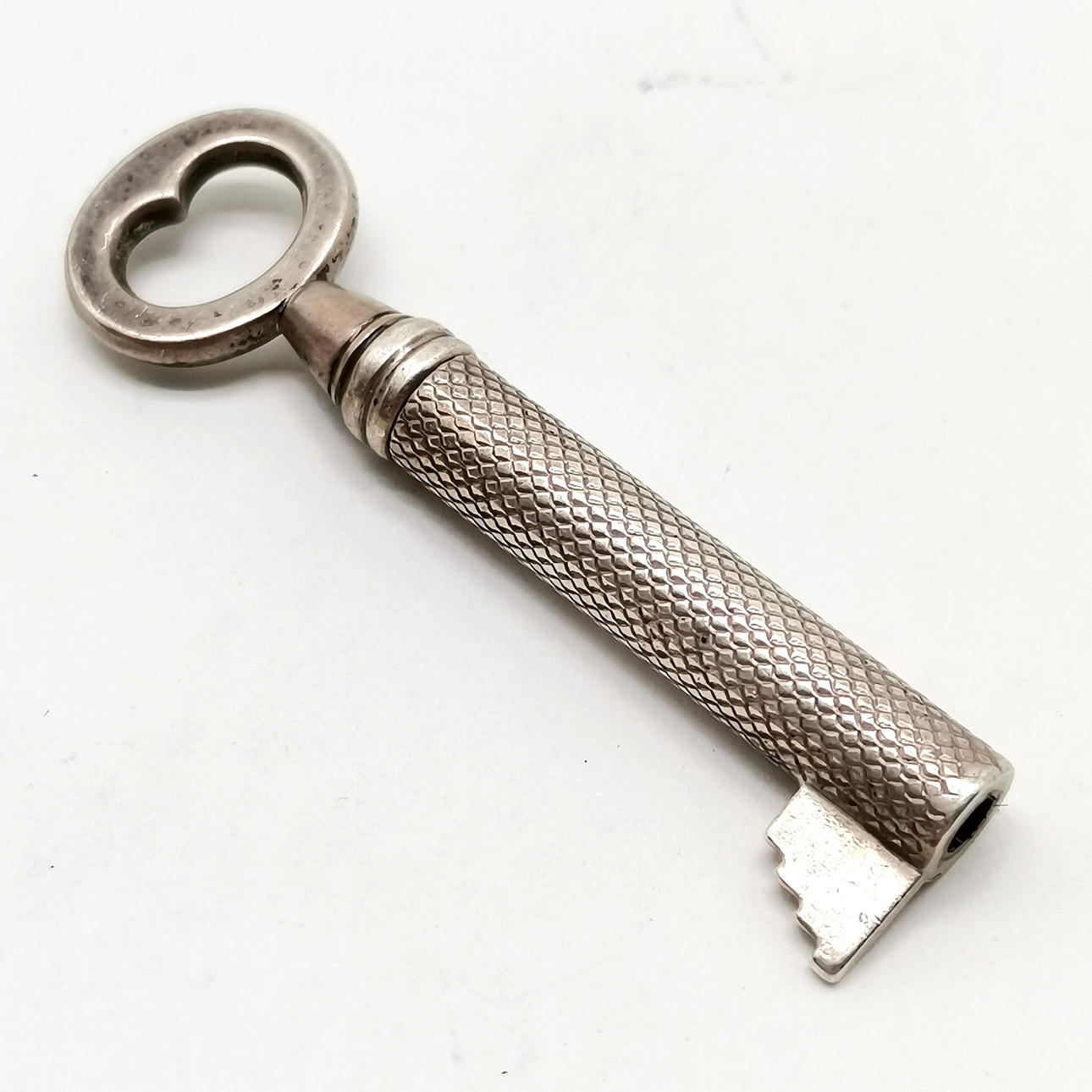 Sampson Mordan unmarked silver propelling pencil in the form of a key with engine turned detail - total 8.5cm & total weight 8.9g.