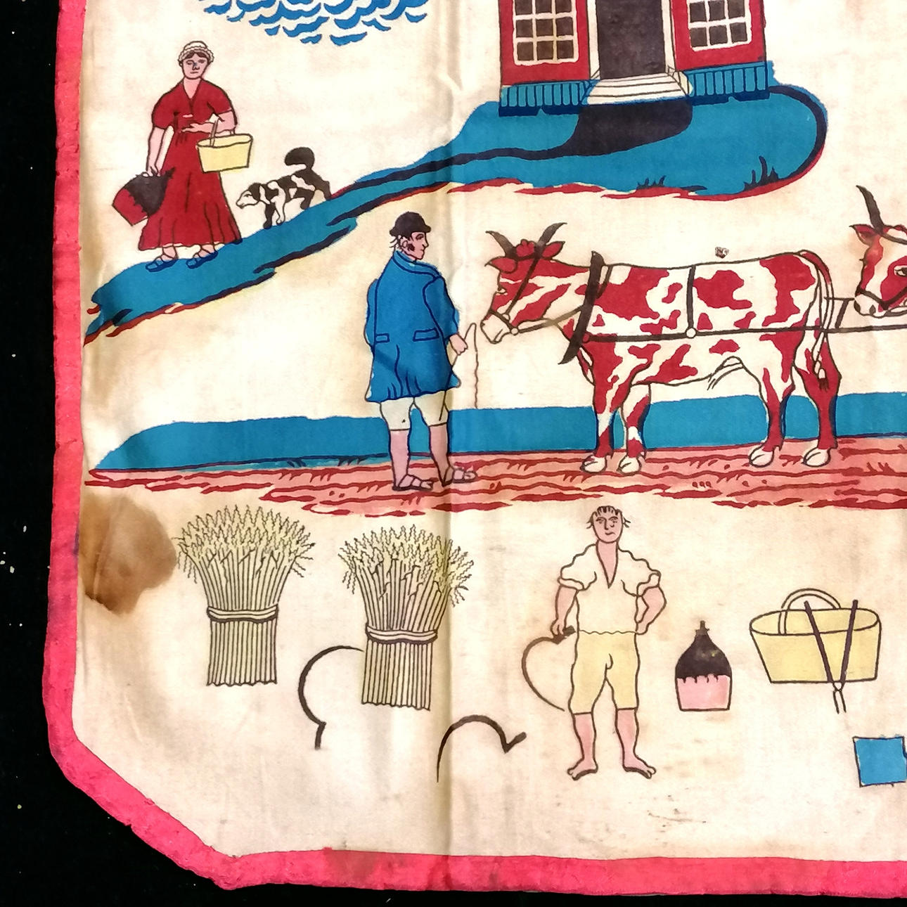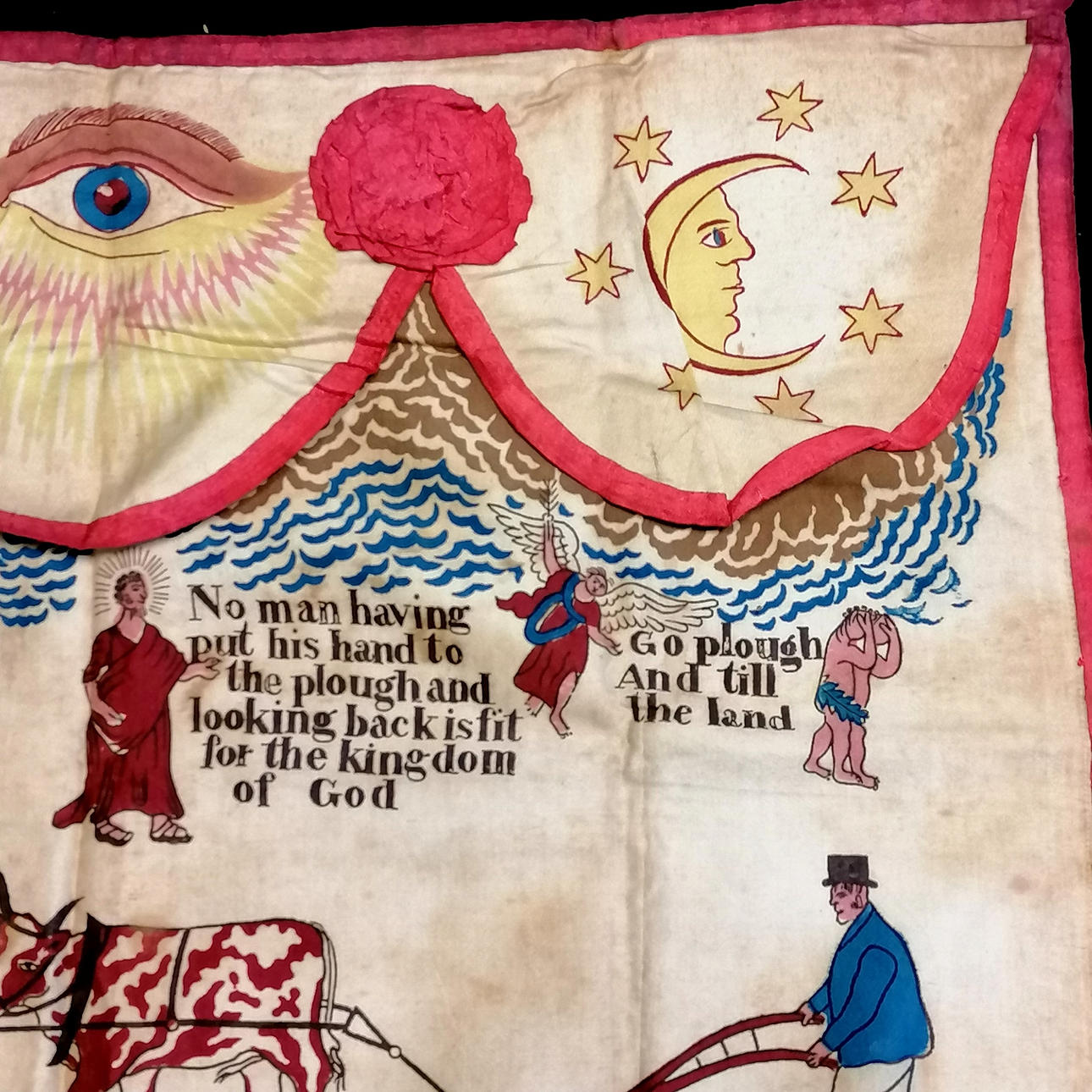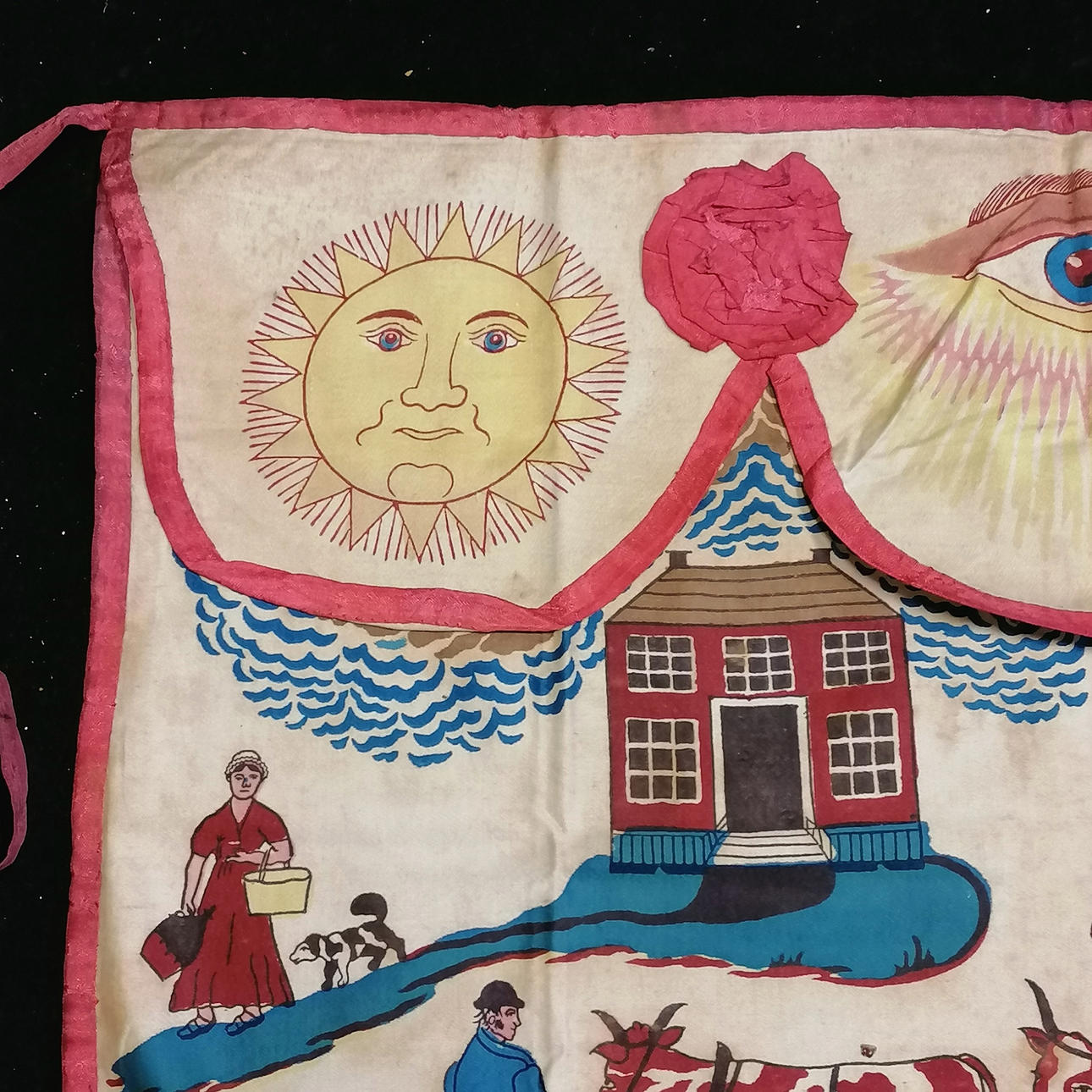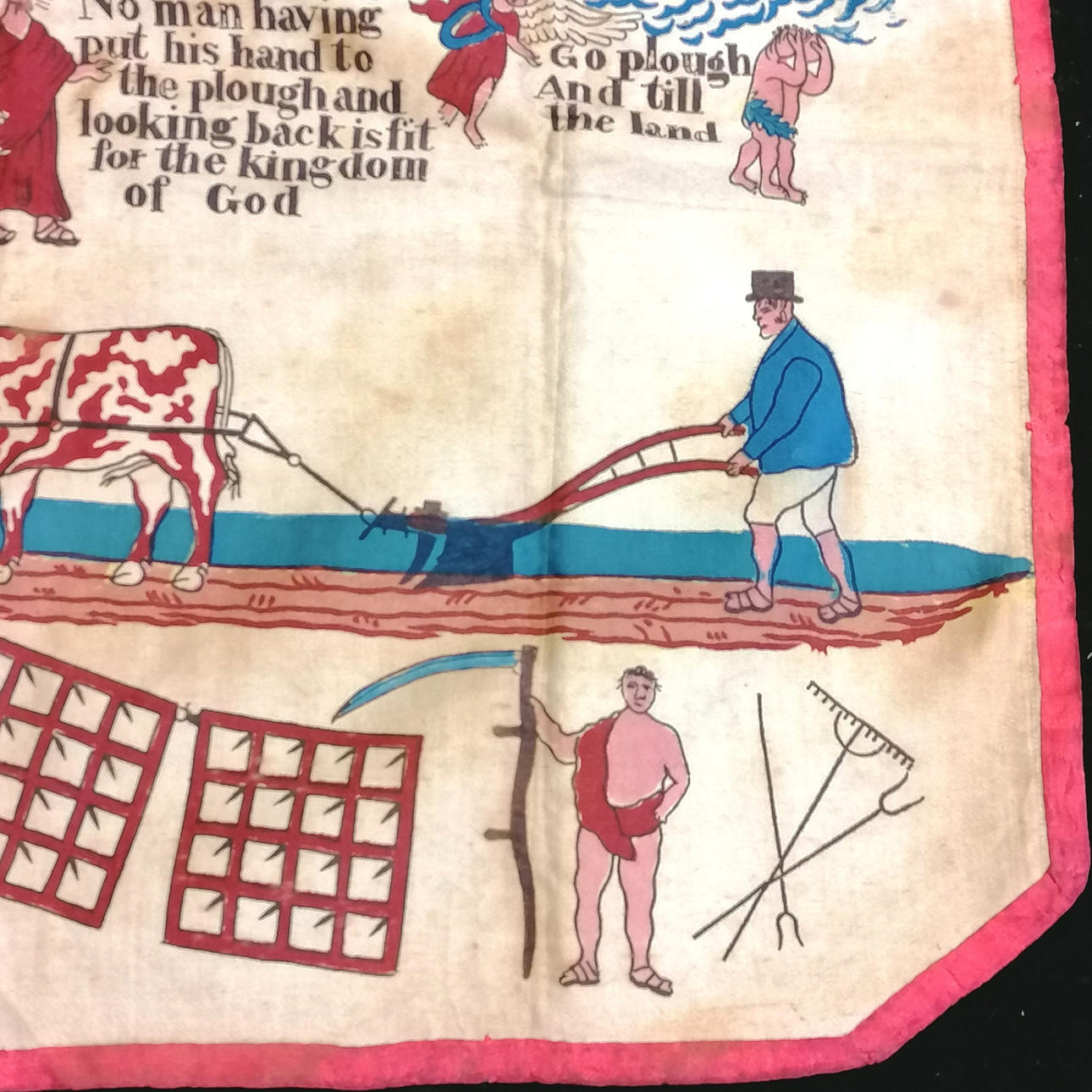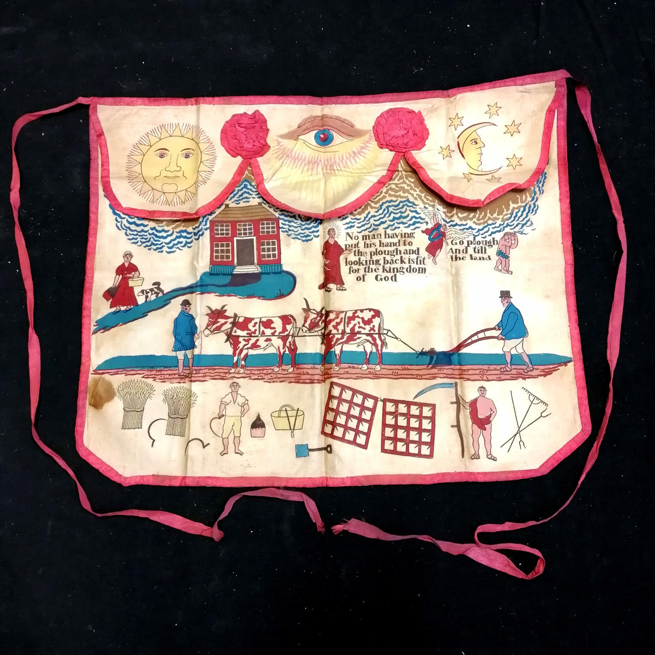 c.1800 Masonic printed cotton apron with agricultural detail inc Biblical figures & motifs & verse - 48cm x 38cm.