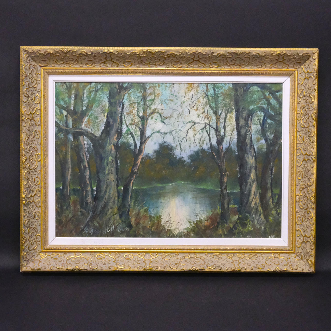 Motif with forest and cross, signed and dated -66, dimensions 64 x 44 cm, frame dimensions 83 x 63 cm.