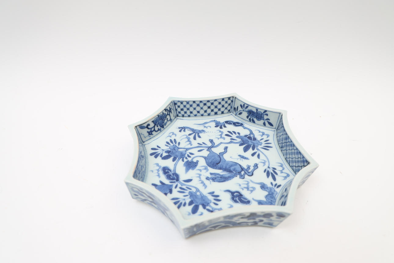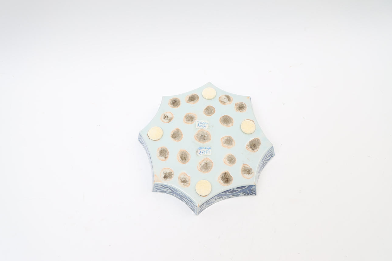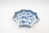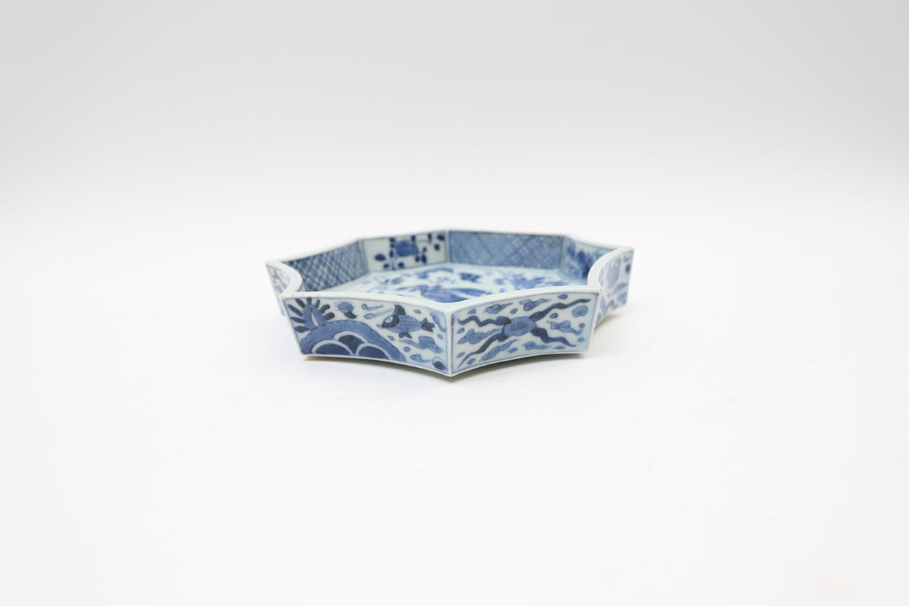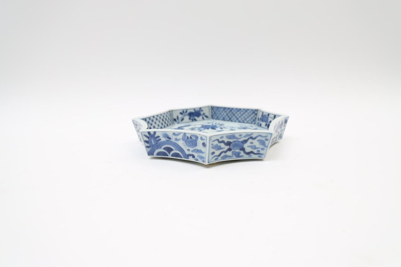 With underglaze blue decor. Octagonal shape.