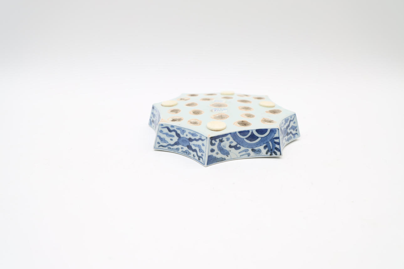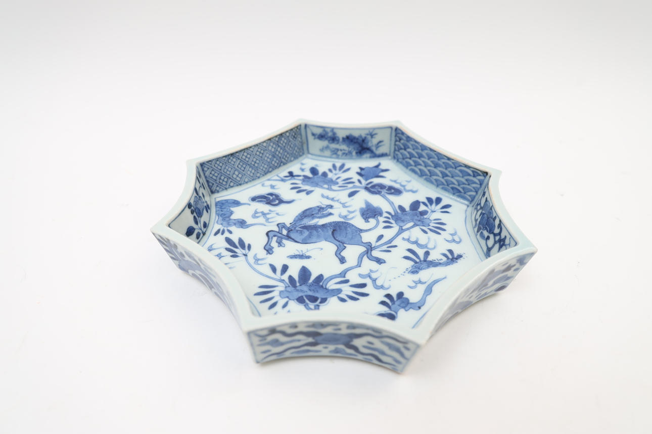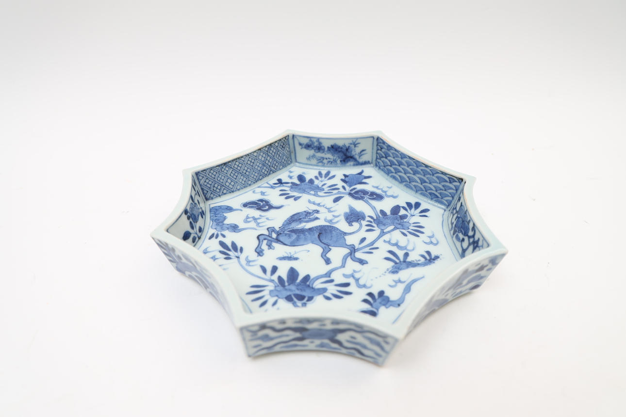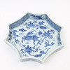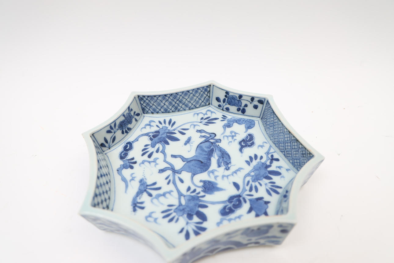 With underglaze blue decor. Octagonal shape.