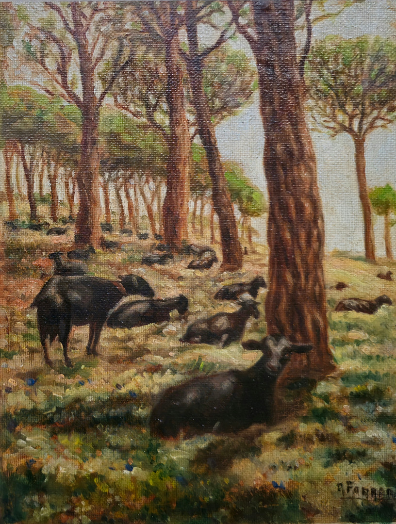 4981092. R FARRES. GOATS RESTING. OIL ON TABLETS.
