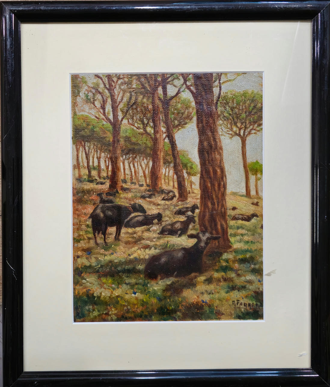R FARRES. GOATS RESTING. OIL ON TABLETS.