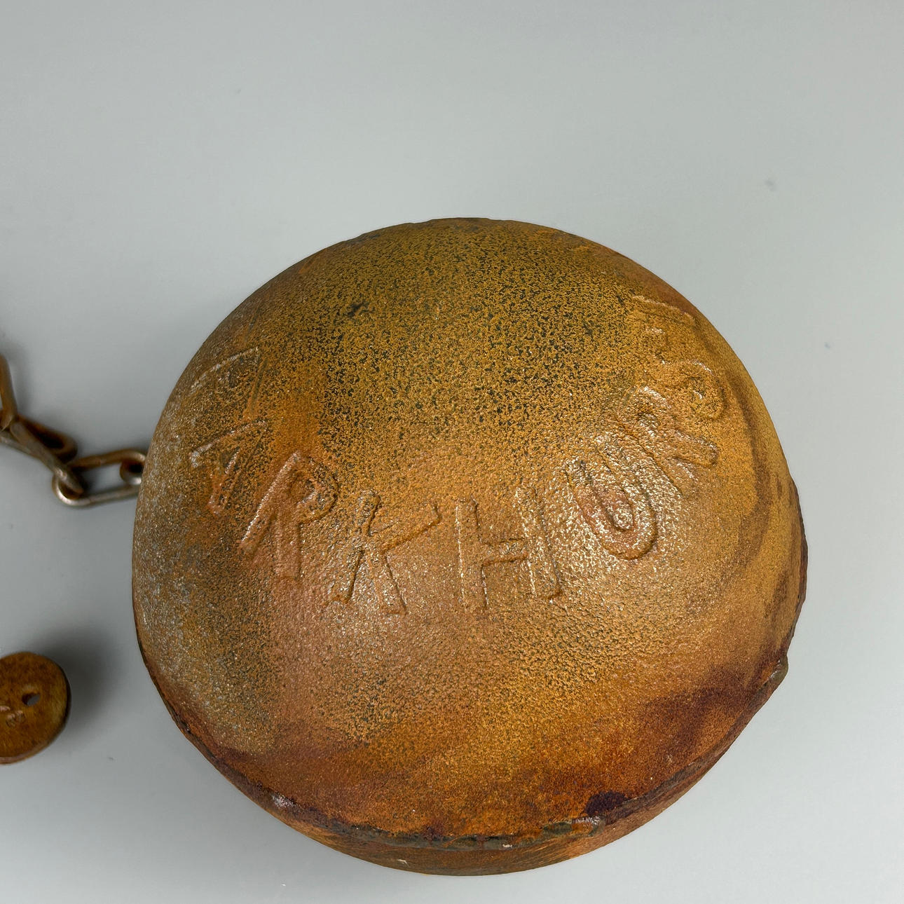 A reproduction HMP Parkhurst ball & chain, Ball Dia. 15cm, chain and shackle L. 58cm.