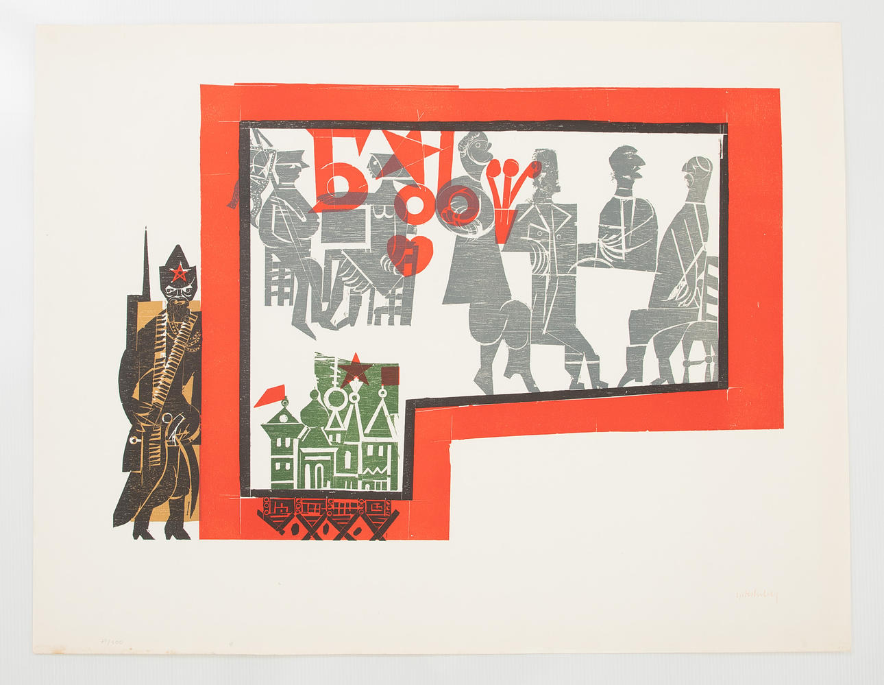 Helmut Andreas Paul GRIESHABER (1909-1981), The Soviets, color woodcut, 1965, signed and numbered, copy 71/100, lower left with the dry stamp of the 'Manus Press, 'ca. 39.5 x 57.5 cm, sheet size approx. 54.5 x 70 cm.