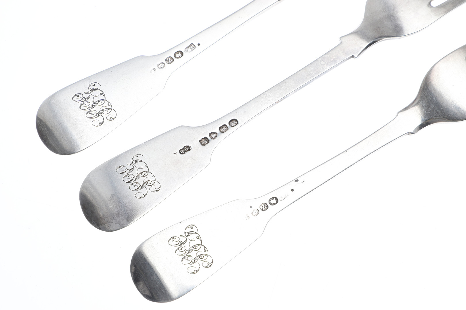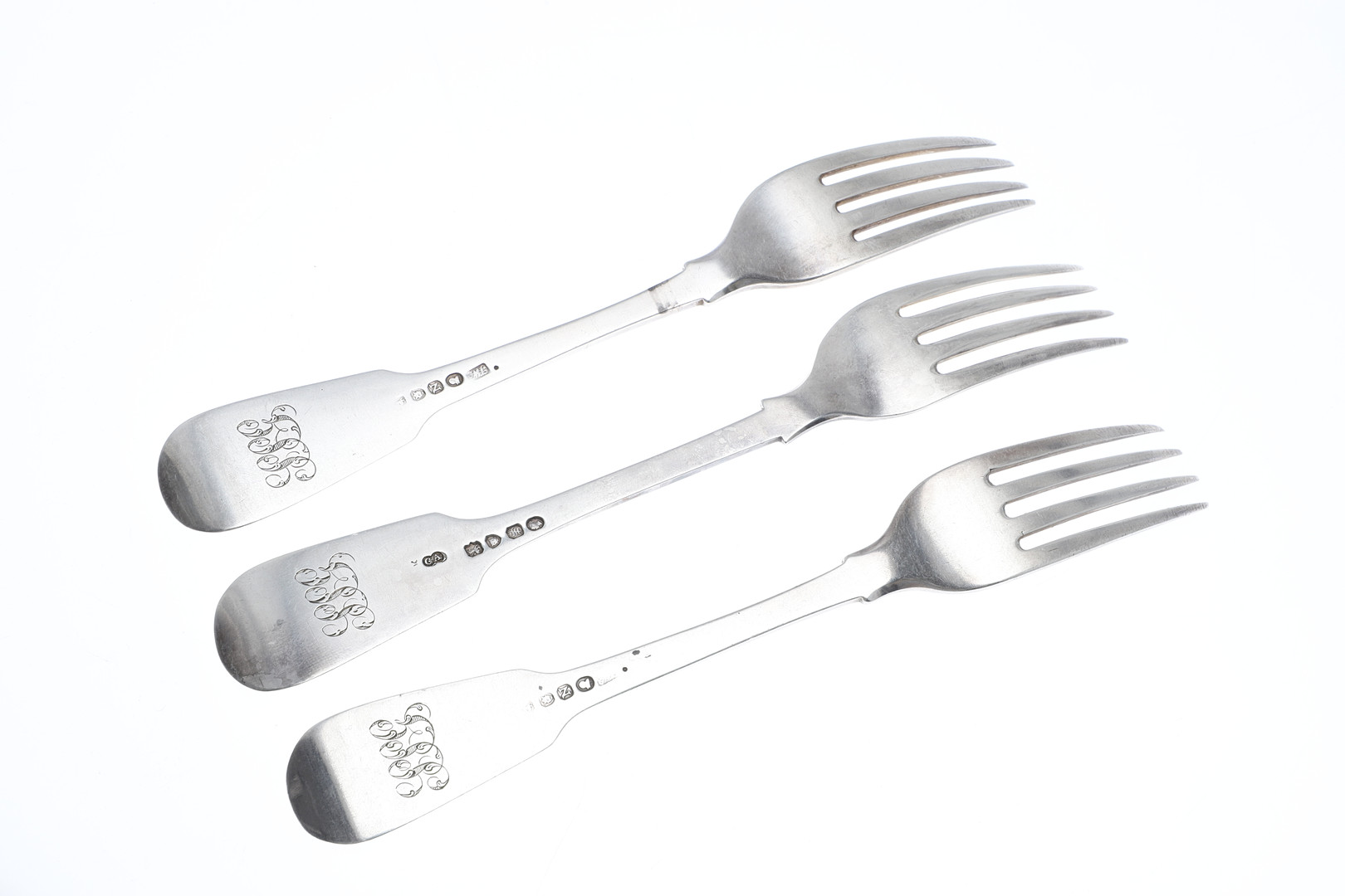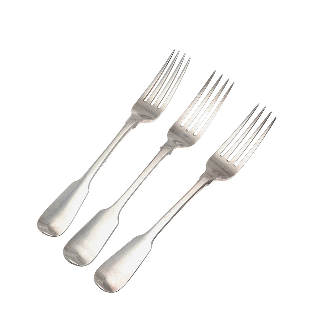 4981377. THREE 19TH CENTURY SILVER FIDDLE PATTERN TABLE FORKS.