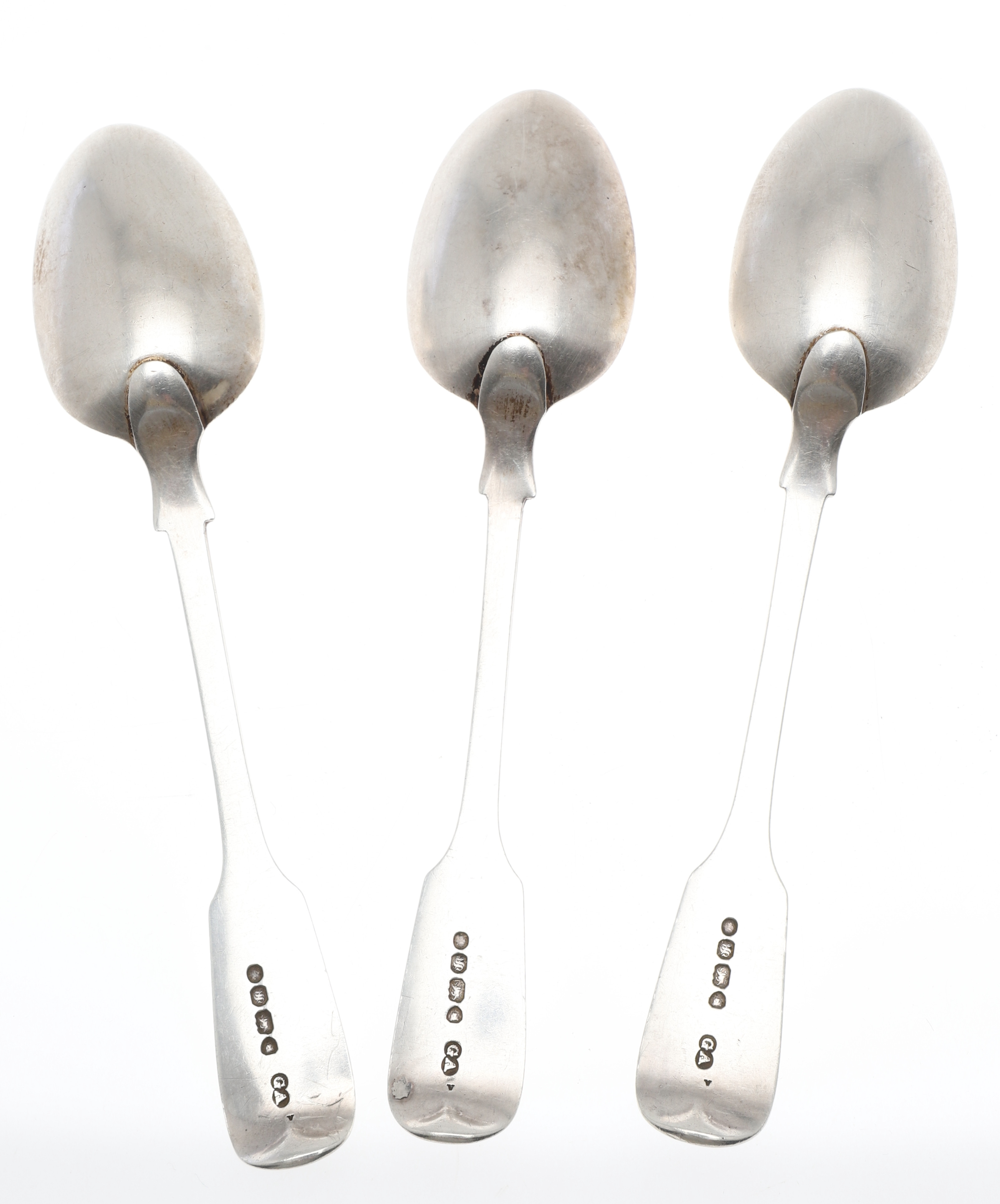 4981431. THREE VICTORIAN SILVER FIDDLE PATTERN TEASPOONS.