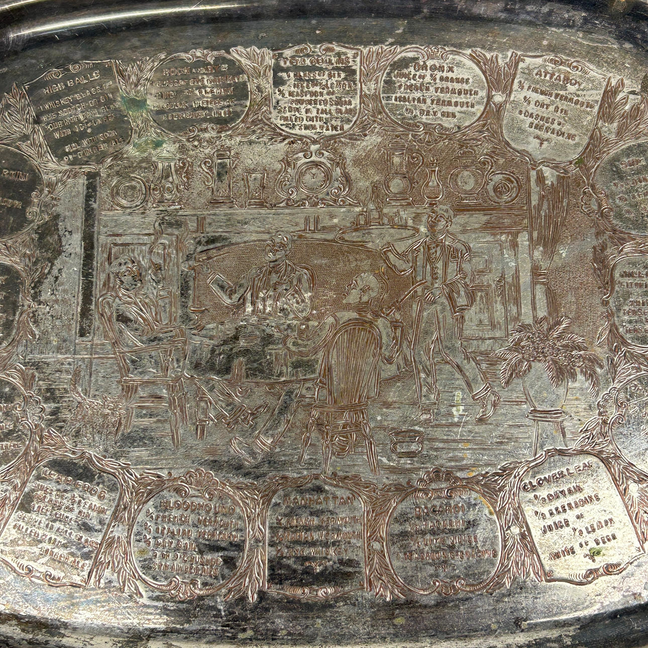 A silver plate drinks/serving tray with public house design, size 54cm x 35cm.
