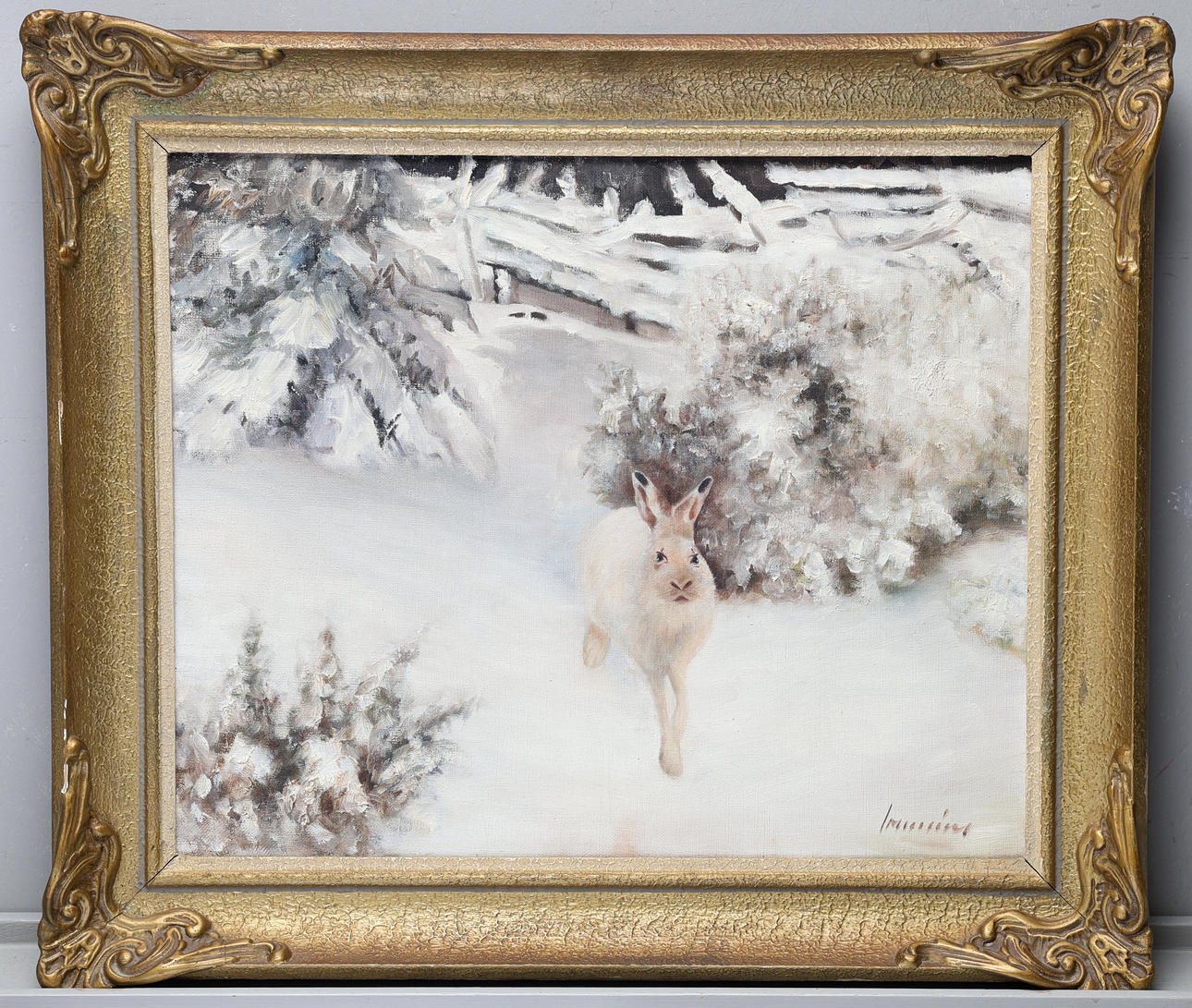 4981600. OIDENTIFIERAD KONSTNÄR. Oil on canvas, winter hare, signed.