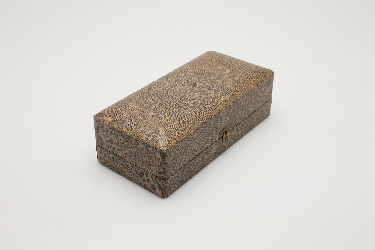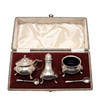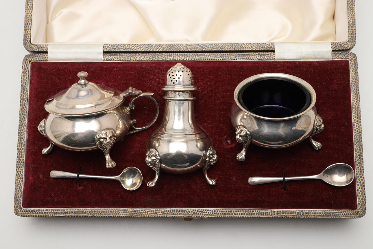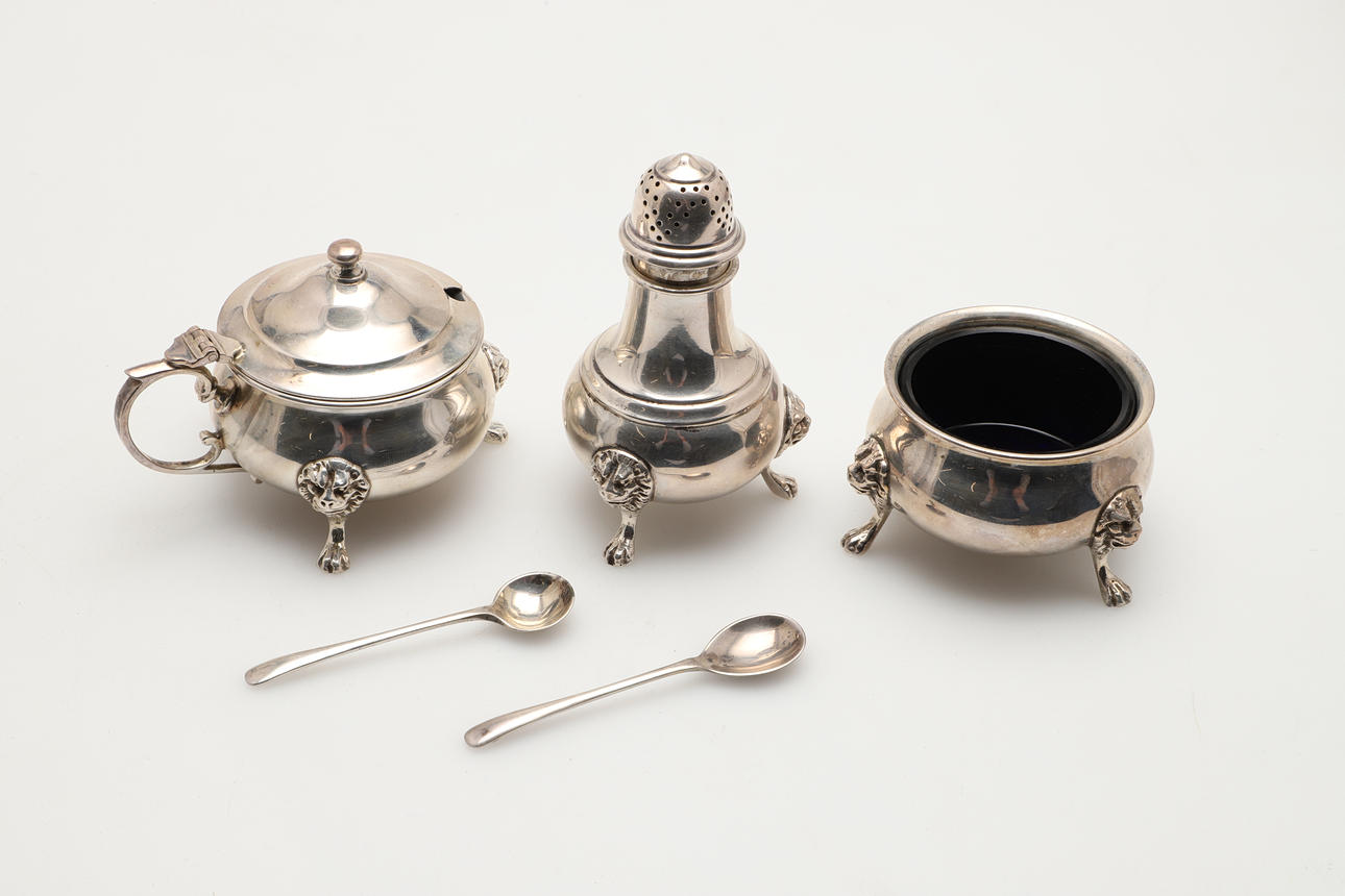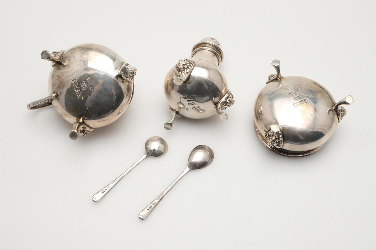 circular form with lion mask paw feet & two non-matching condiment spoons, in original fitted case, (blue glass liners), by Walker & Hall, London 1956; the case 10.25" (26cm) long; 7ozt.