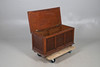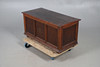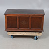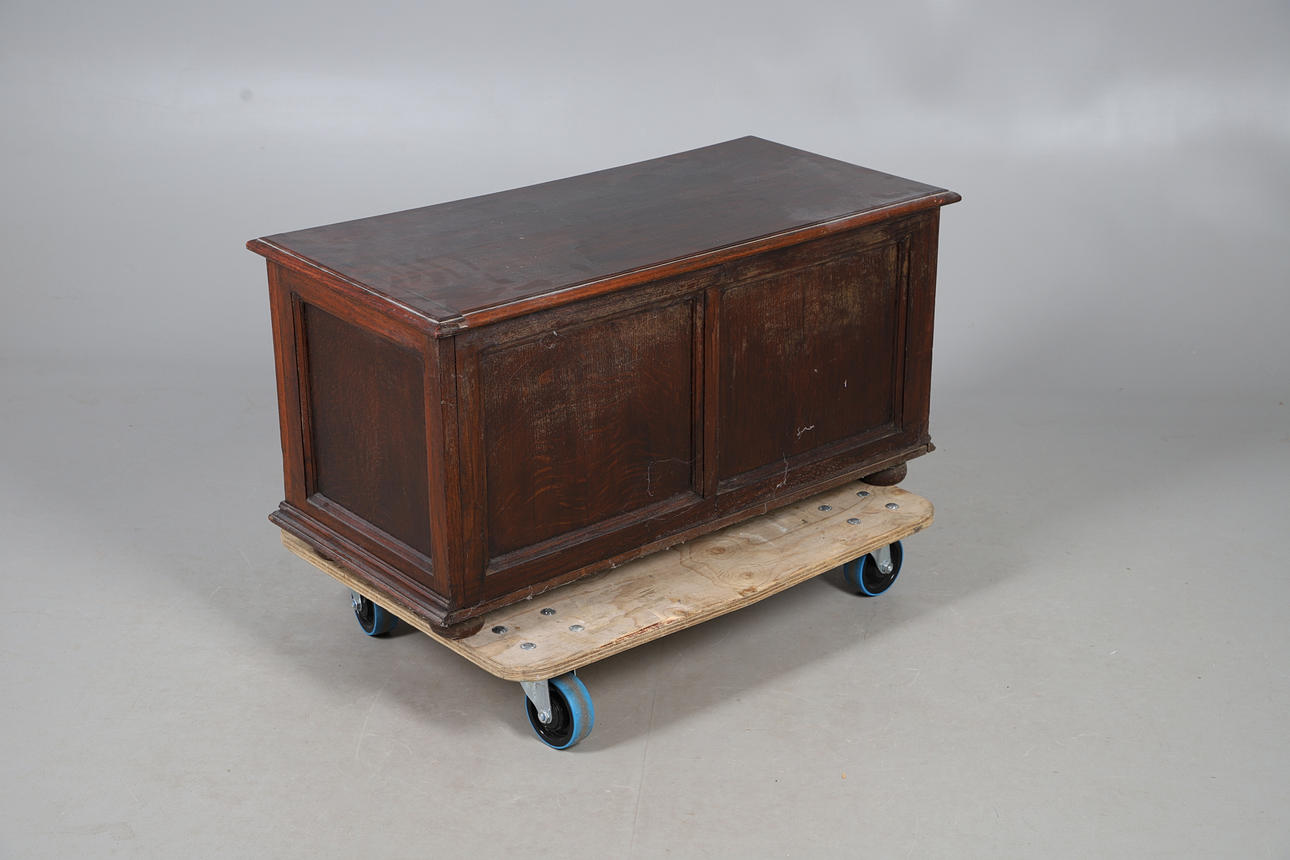 An oak blanket box, with three panels to the front and raised on bun supports. 46cm (h) x 92cm (w) x 44cm (d).