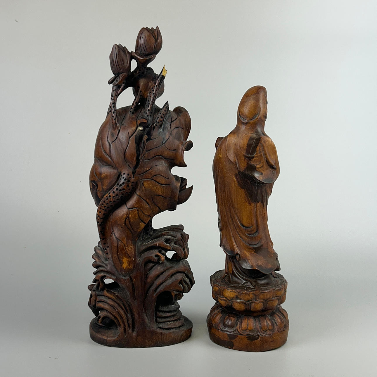 Two Chinese carved wooden figures, one of the goddess Guanyin and one other, tallest H. 38cm, W. 13cm.