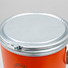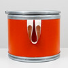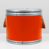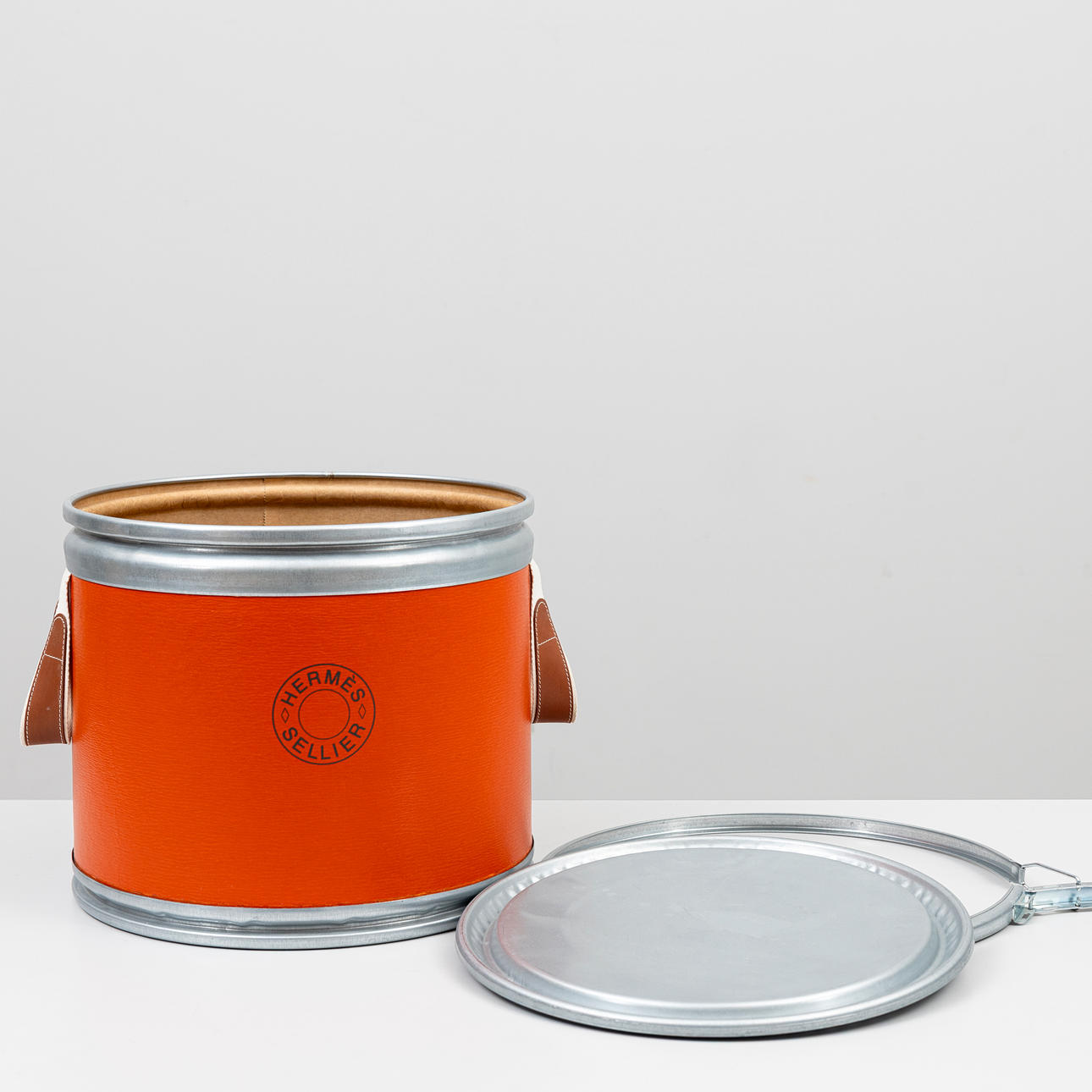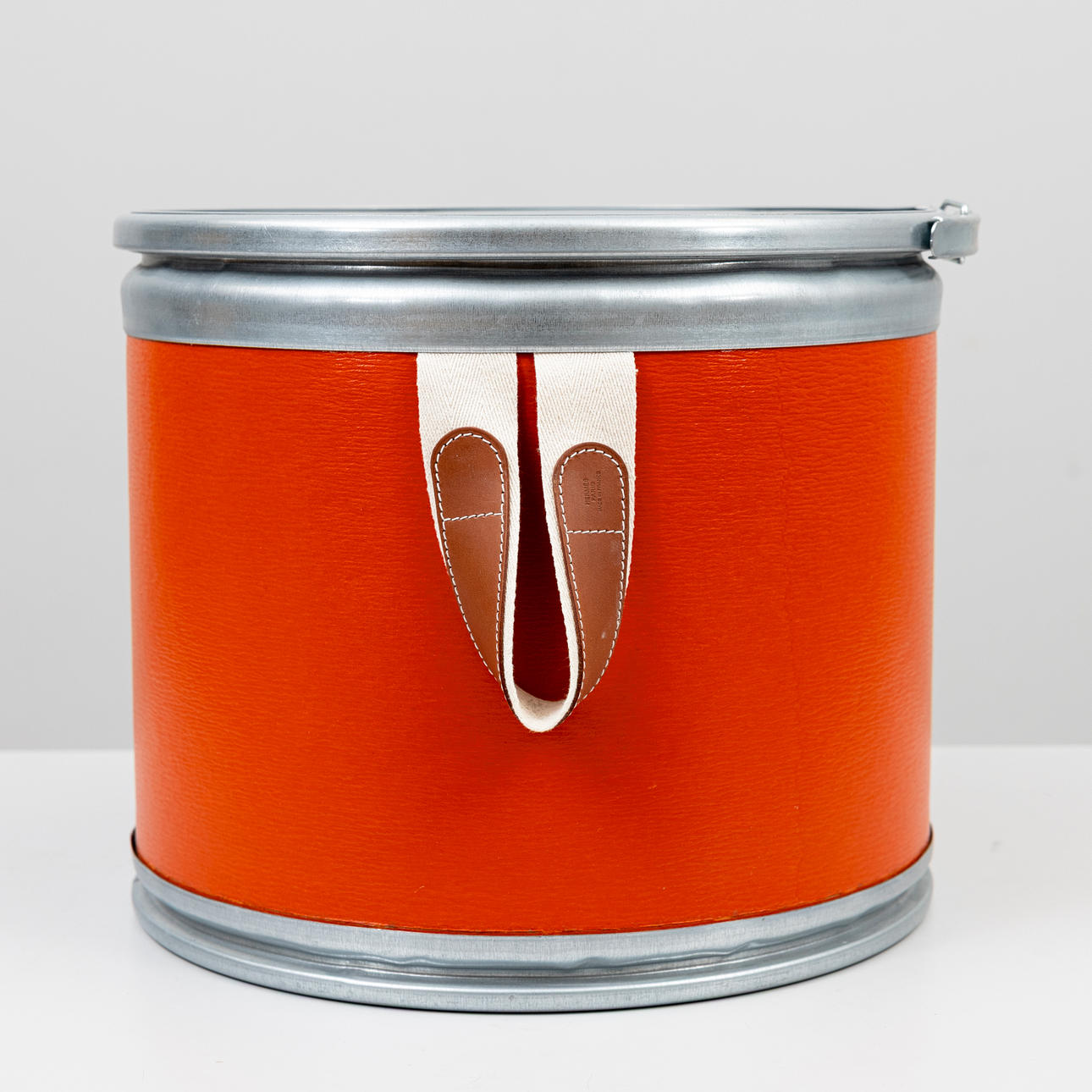 Round box in orange rigid cardboard with tin lid. Marked “HERMÈS SELLIER”. Two carrying straps on the sides, marked “HERMÈS PARIS MADE IN FRANCE”.