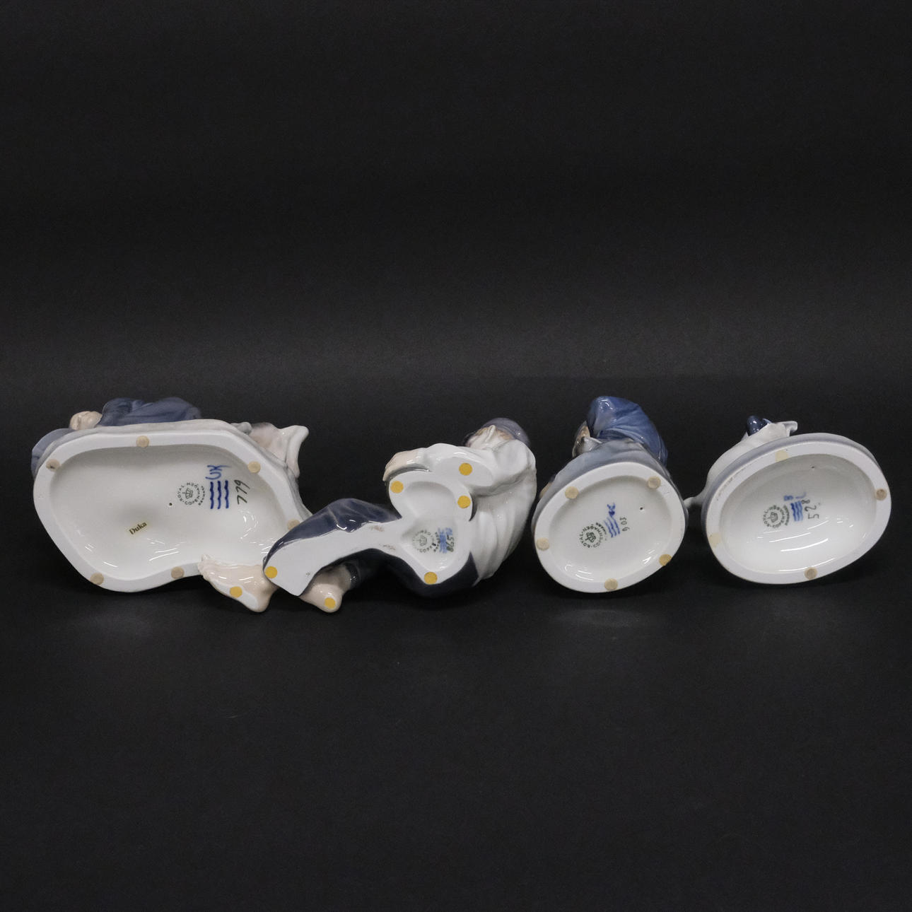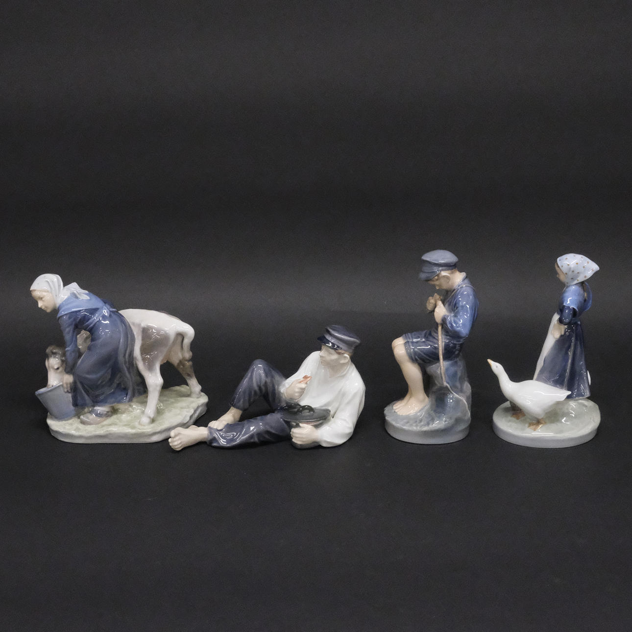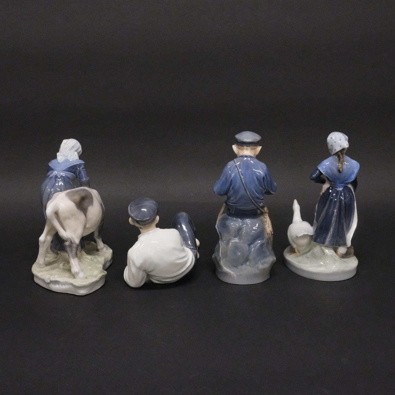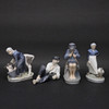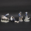 The Boy Who Talked, No. 905, height 18,5 cm, Boy has lunch break, no. 865, height 11 cm, length 19 cm, Girl with goose, no. 528, height 18 cm and Girl with calf, no. 779, height 16 cm, I sort.