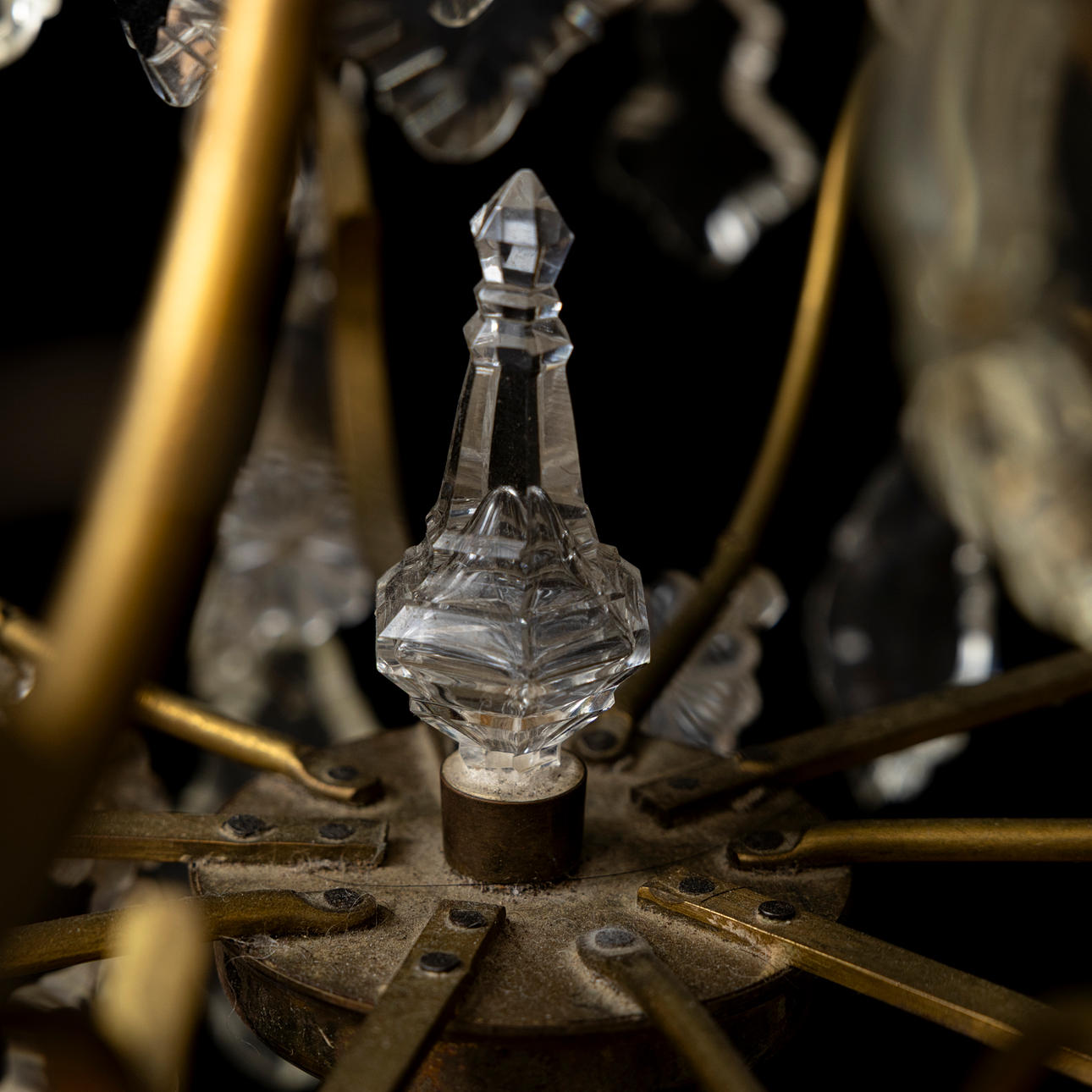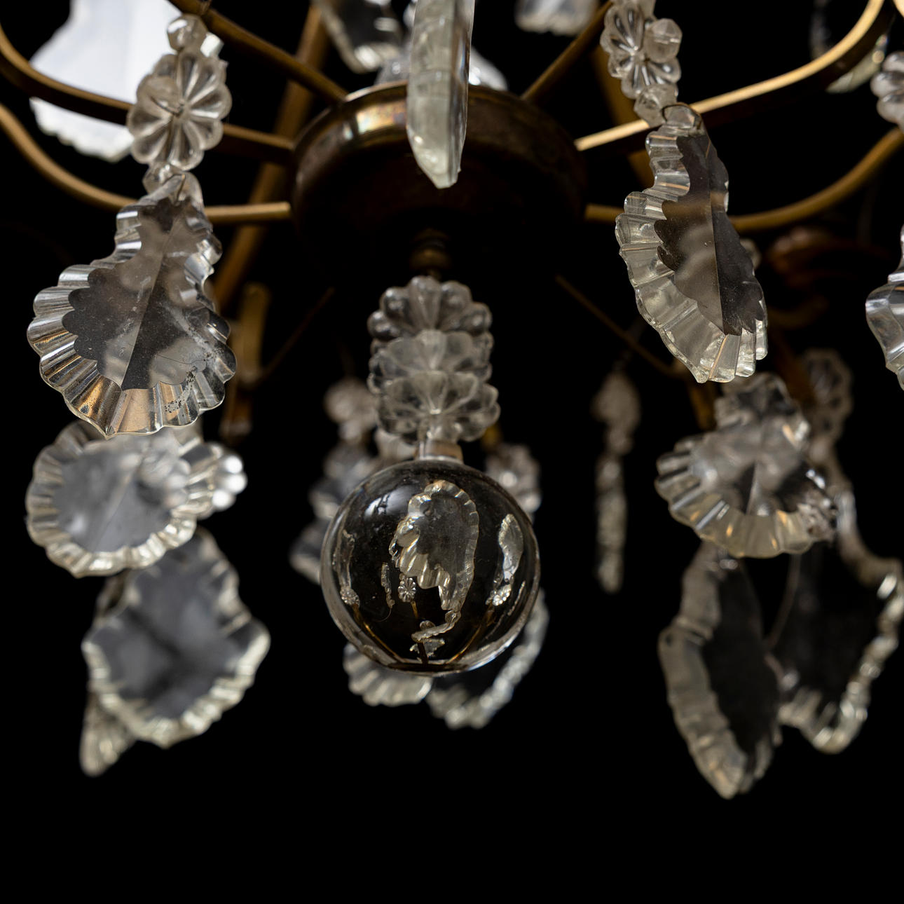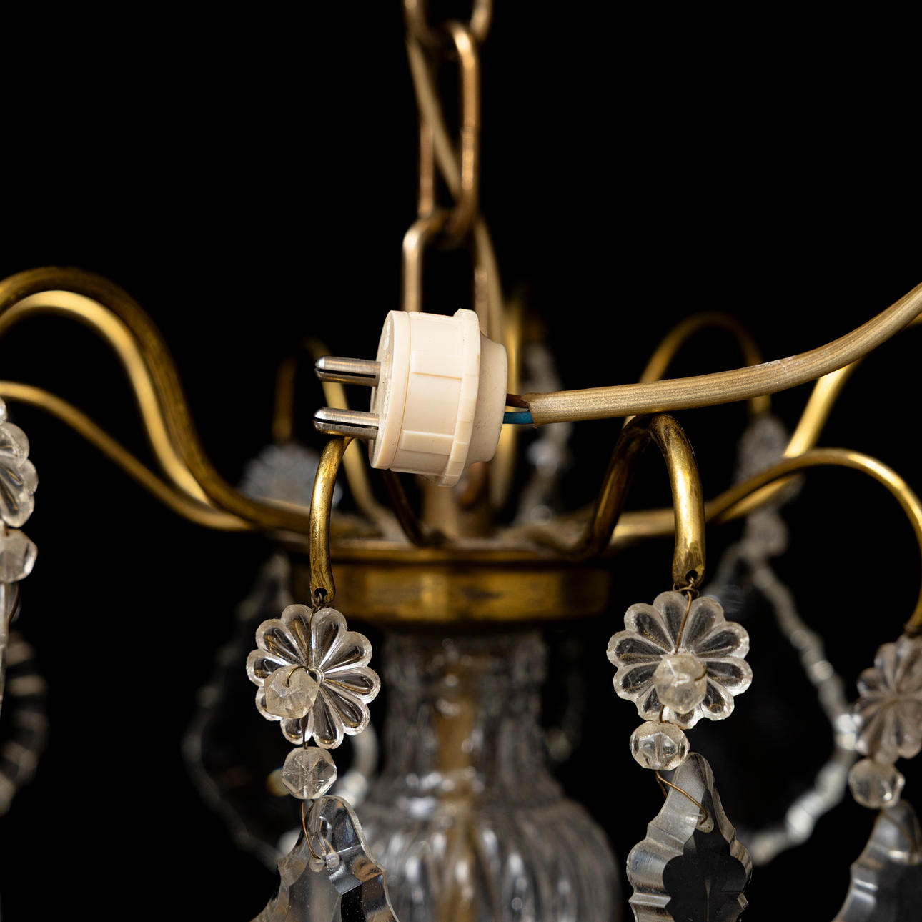 Cage-shaped, surrounded by different-shaped prisms. 5 light arms, interior electric lighting. Diameter about 45 cm.