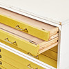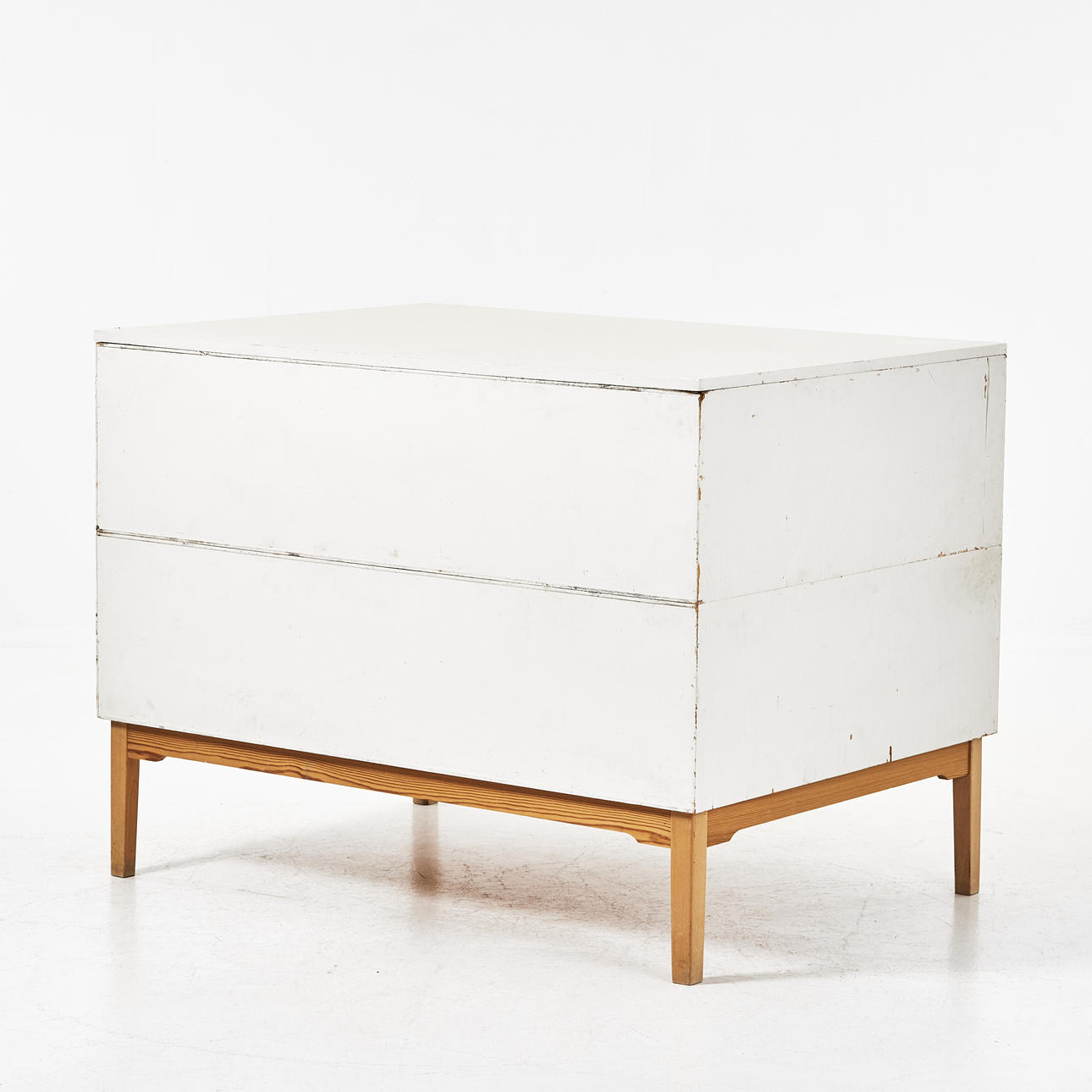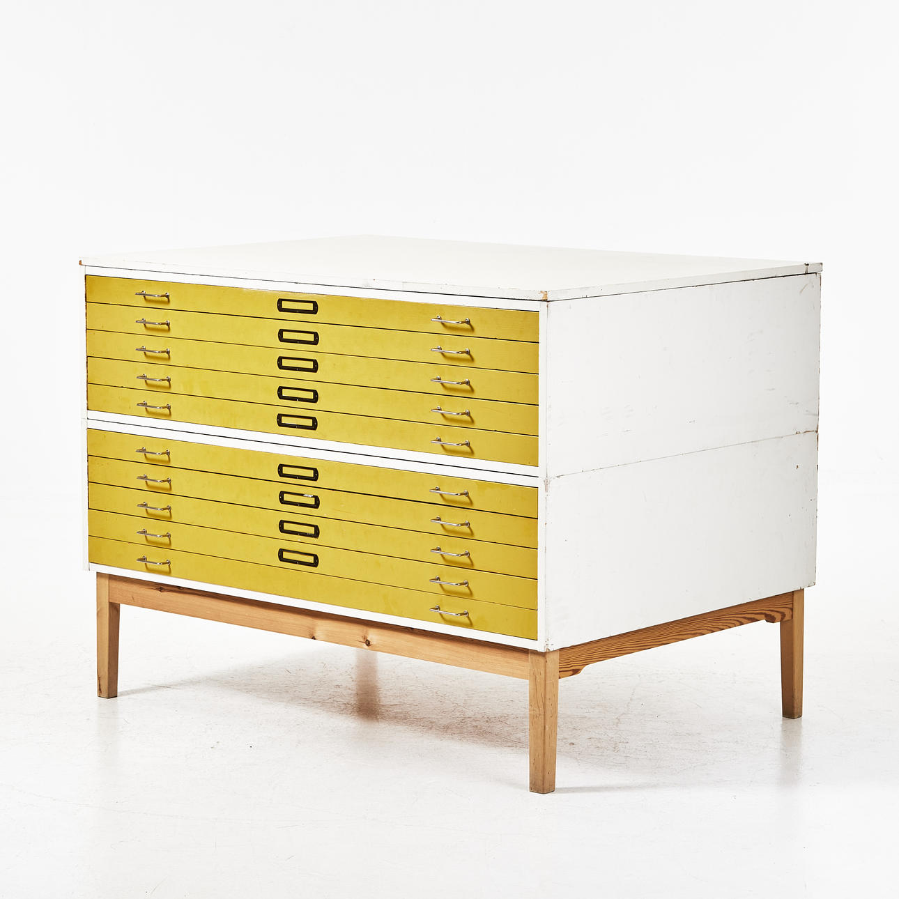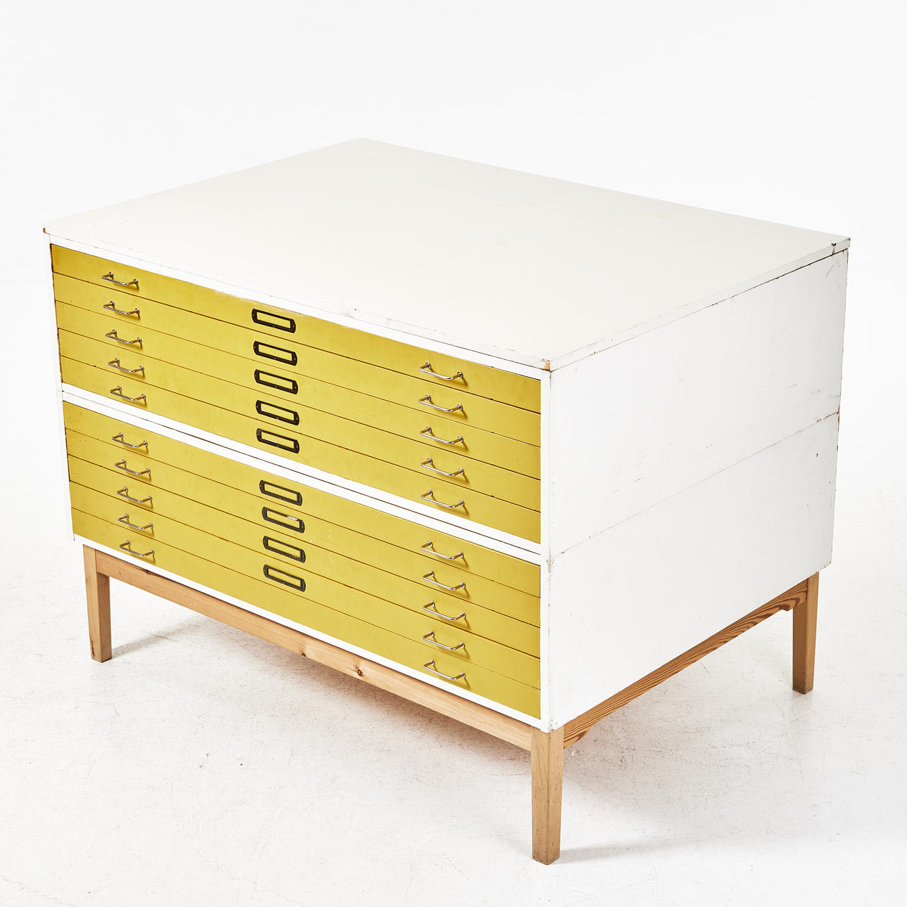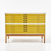 Yellow painted drawer fronts, wooden base, two-piece cabinet, dimensions approx. 104, 135 x 95 cm.