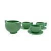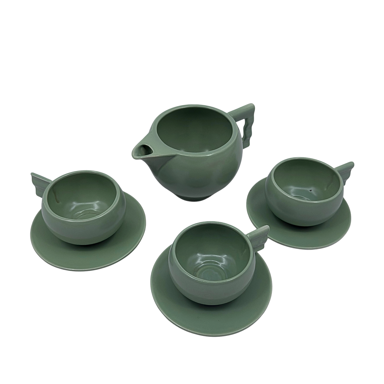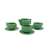 Seven-piece ceramic service in green. The set consists of 3 cups, 3 saucers and a teapot without a lid.