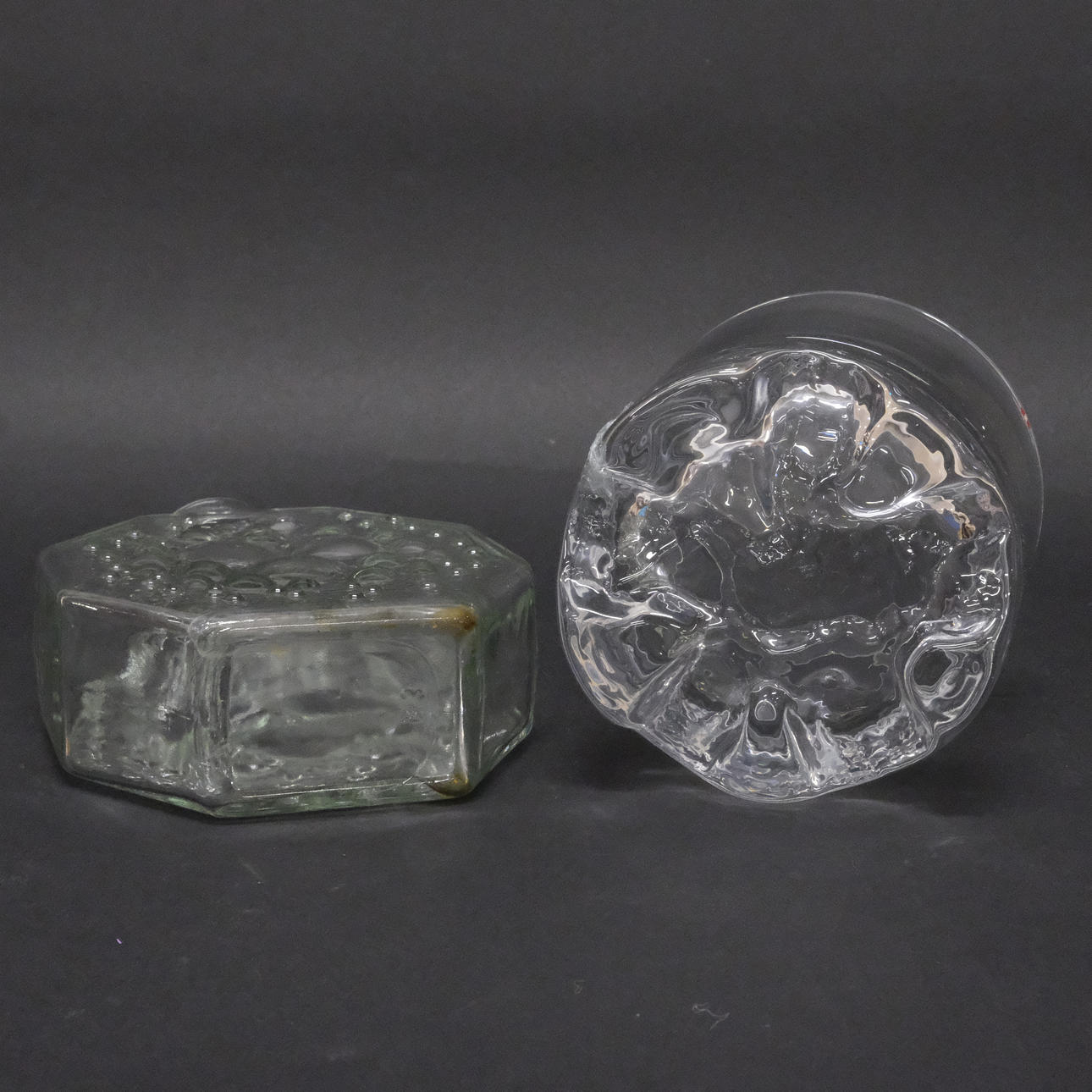 Tapio Wirkkala, Iittala, ice bucket "Gaissa “, height 11 cm, diameter 11.5 cm, ice tongs Finland, length 17,5 cm. Nanny Still, Riihimäen Lasi, Finland, bottle "Stella Polaris “, height 17 cm.