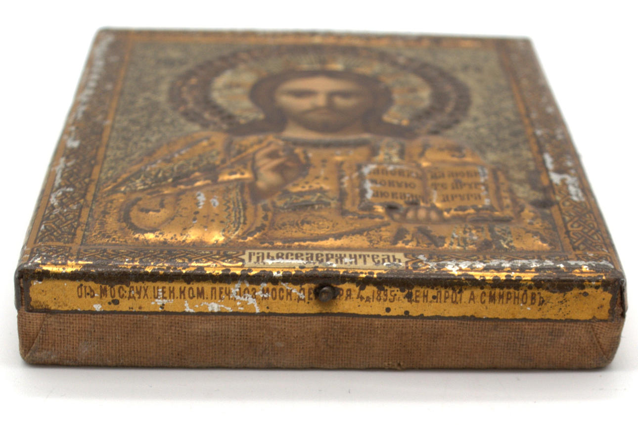 Ancient icon, Christ Pantocrator, metal Oklad, dated 1895. Dimensions: approx. 9 x 7 x 1.2 cm.