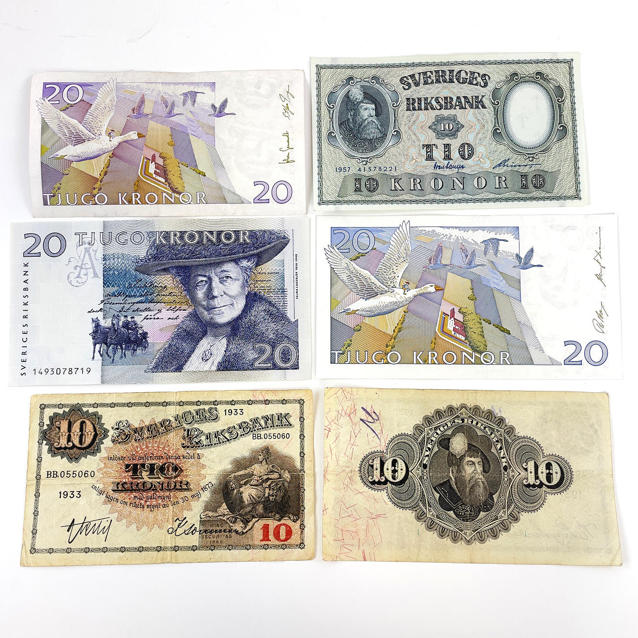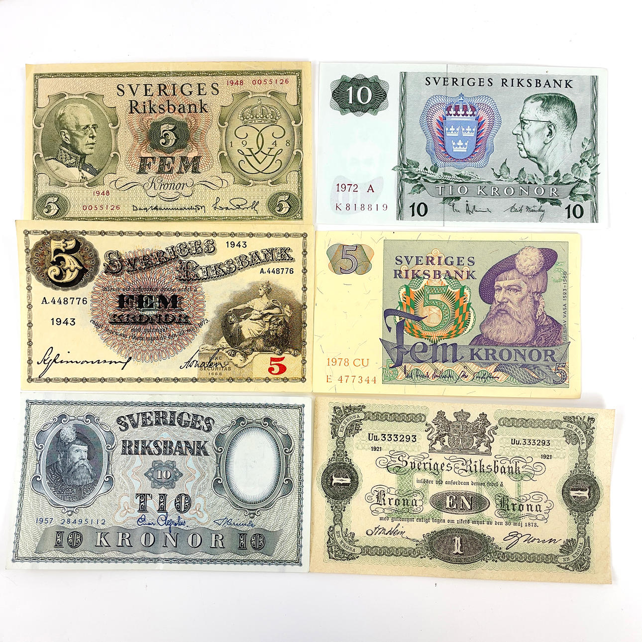 50 kronor, 2 pcs 20 kronor, 5 pcs 10 kronor, 1937-1959, 15 pcs 10 kronor, 1971-1987, 5 pcs 5 kronor, 1914-1963, 34 pcs 5 kronor, 1973-1981, 17 pcs 1 crown, 2 pcs, 1918, 1921.