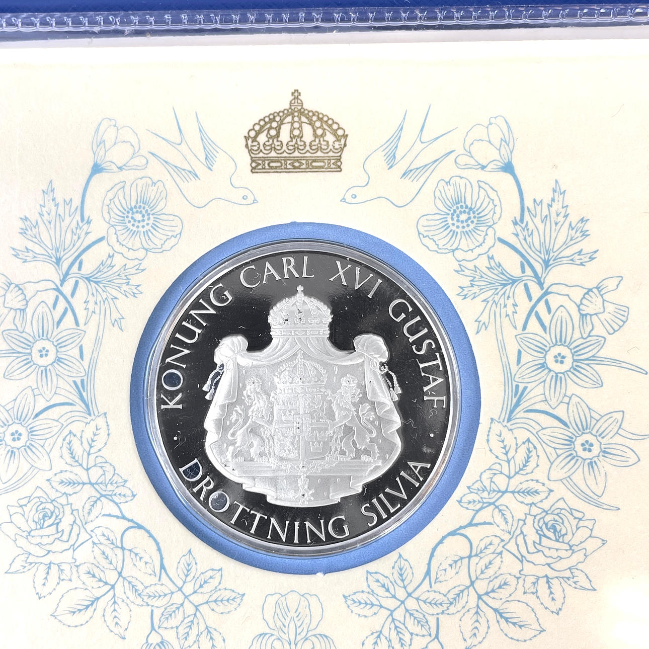 1 piece Carl XVI Gustaf commemorative coin, Crown Princess Victoria, silver 925. Diameter about 36 mm Weight about 27 grams. Case size 6,5x6,5x1 cm