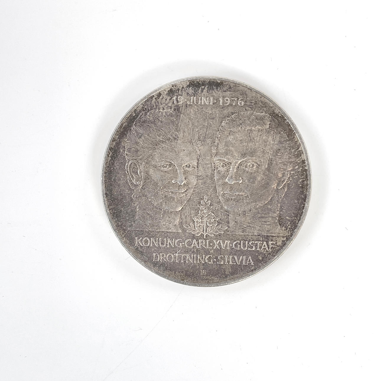 1 piece 50 kr, 1976, silver 925. The wedding between King Carl XVI Gustaf and Queen Silvia. Diameter approx. 36 mm, weight approx. 26,89 grams