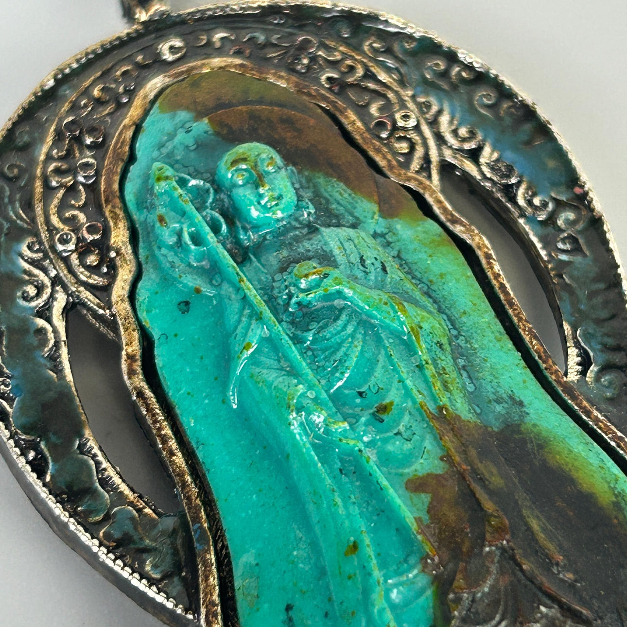 A white metal and reconstituted turquoise pendant of a goddess, L. 7.5cm, W. 4.5cm.