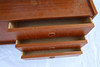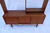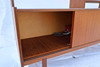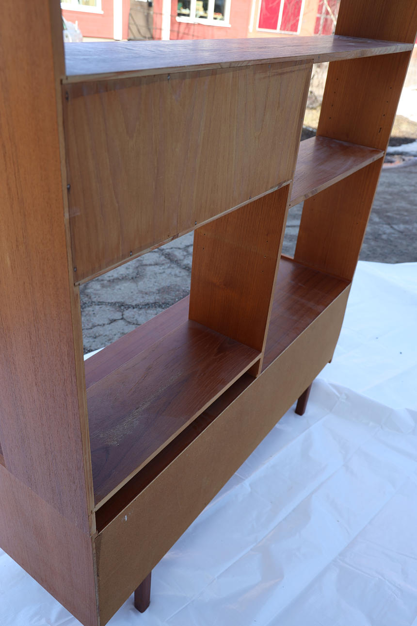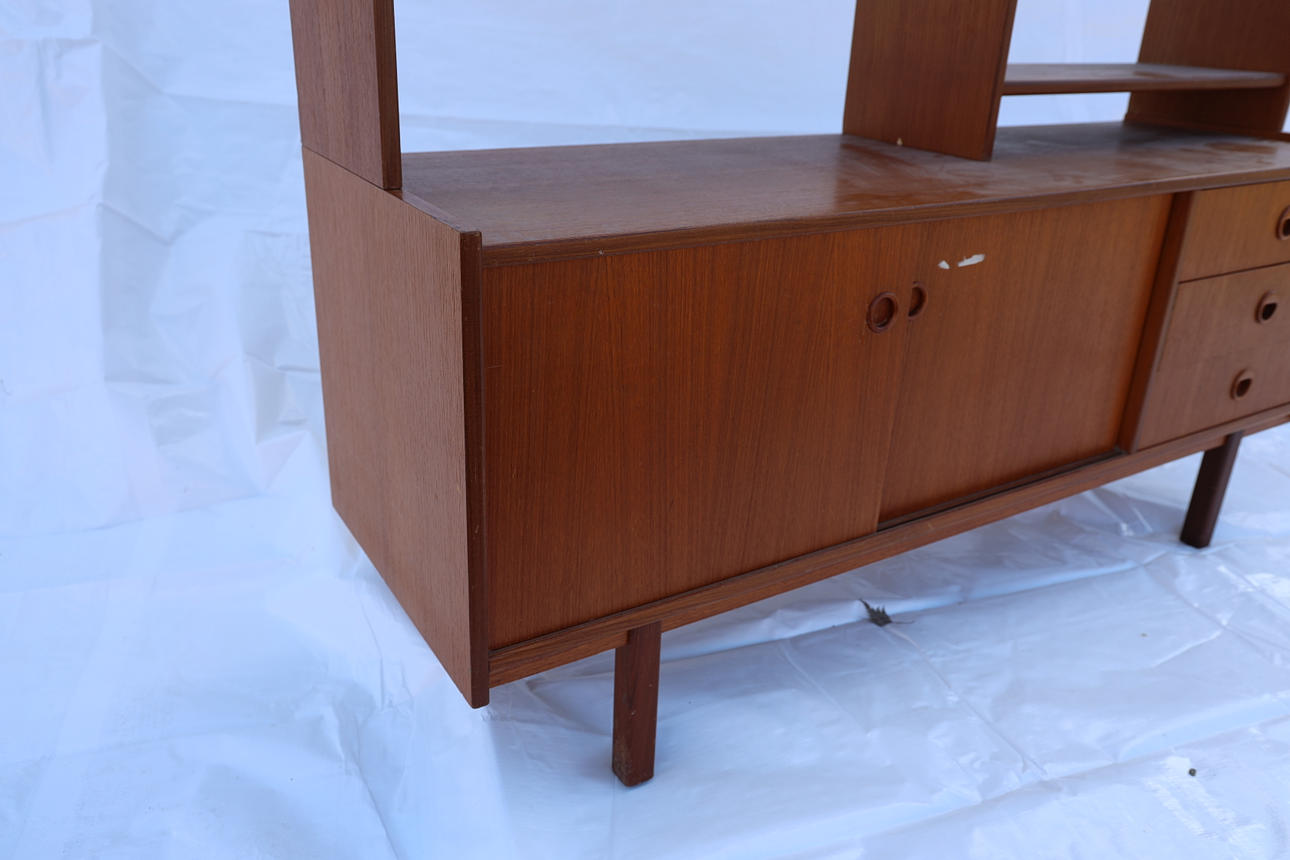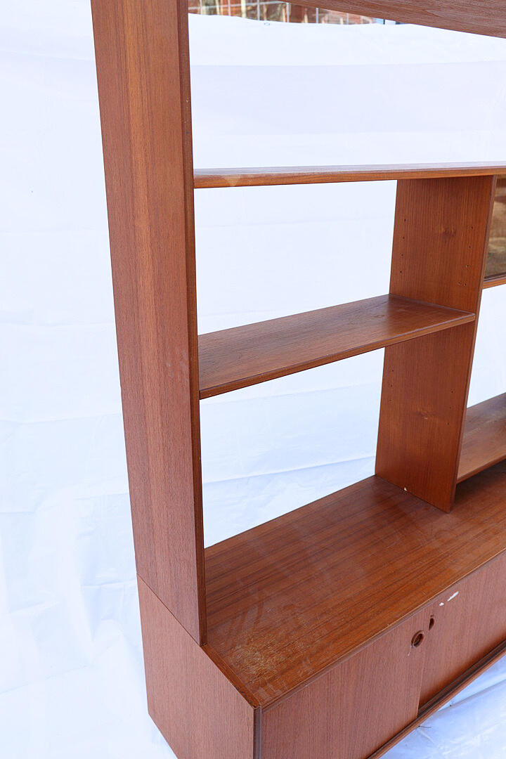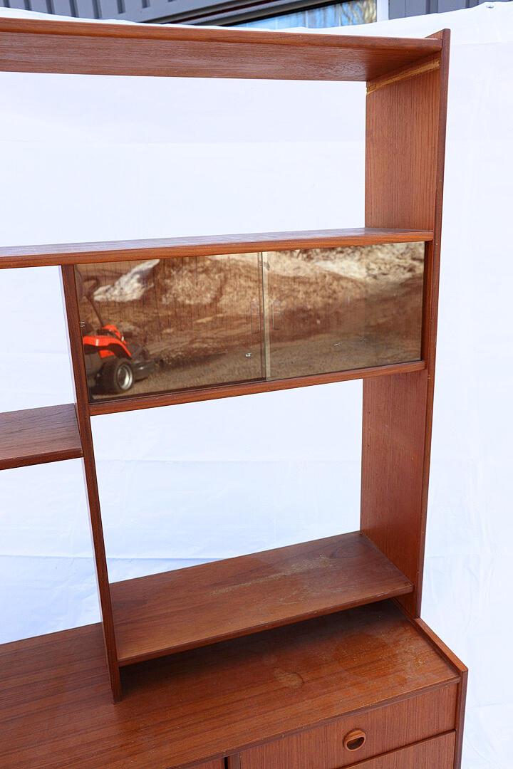 Teak, two-piece. Top with shelves and display case. Double sliding doors, interior with a glass shelf.