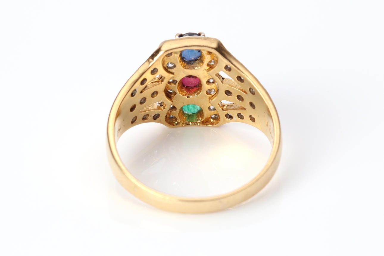 4983370. RING. Gold with sapphire, ruby and emerald with brilliant cut diamonds, total weight approx. 6.2 grams.