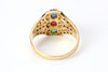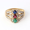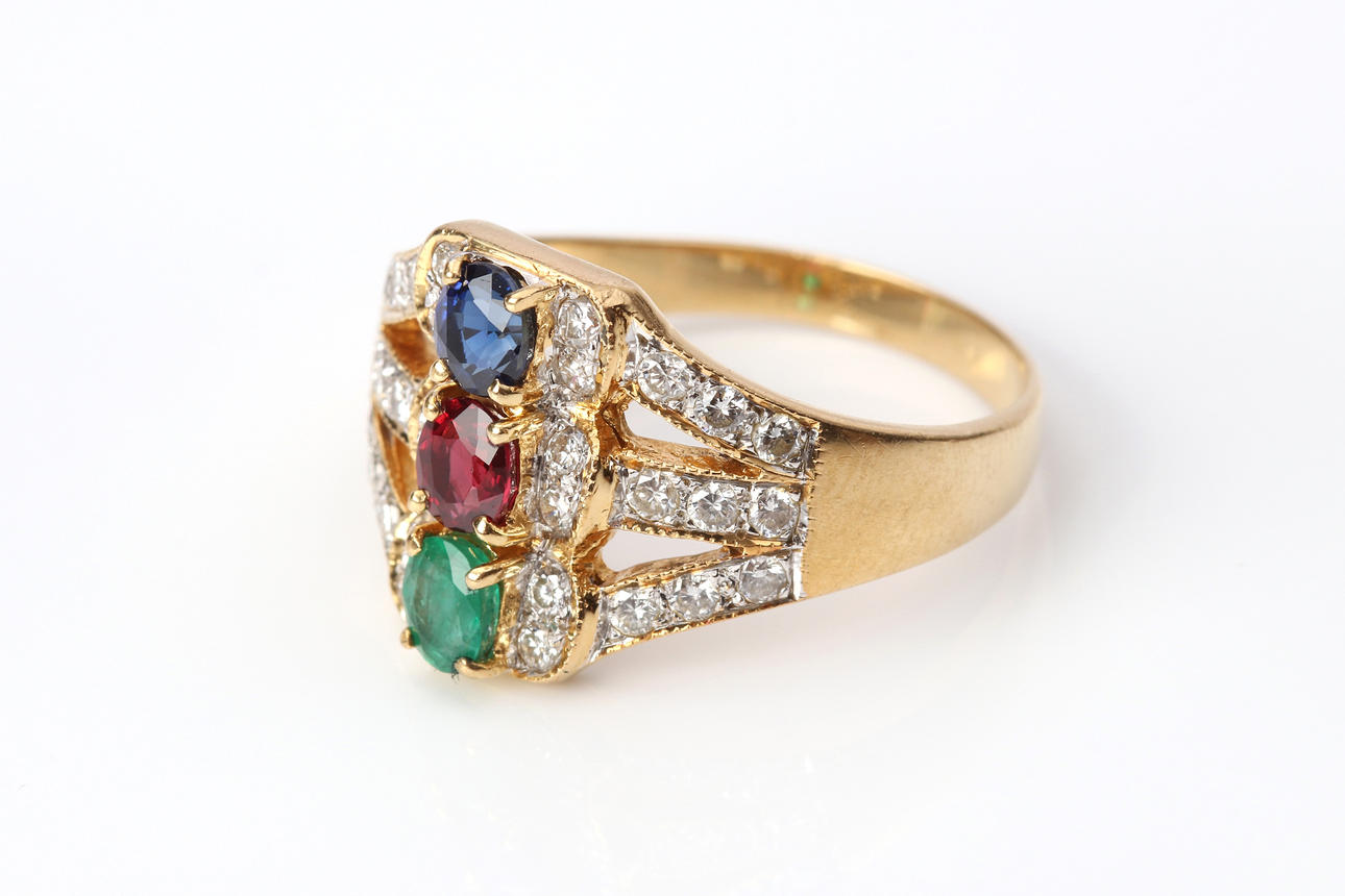 RING. Gold with sapphire, ruby and emerald with brilliant cut diamonds, total weight approx. 6.2 grams.
