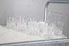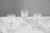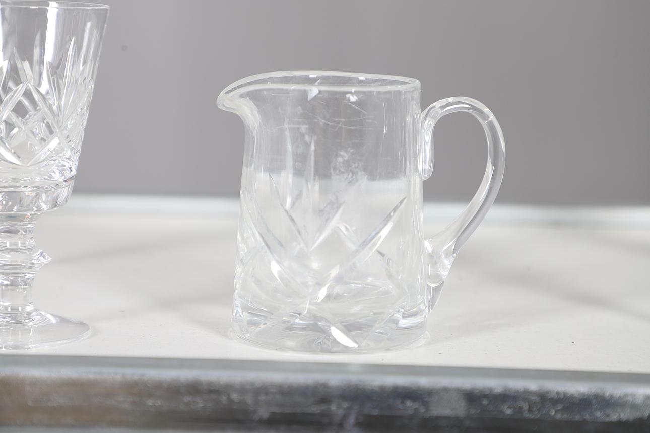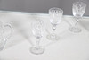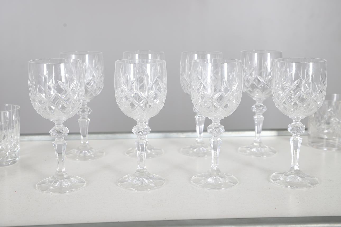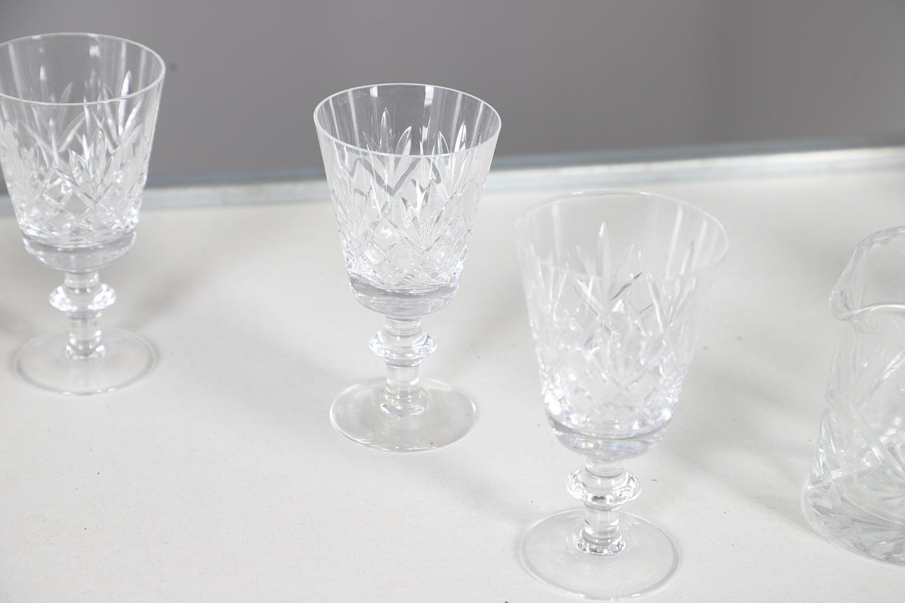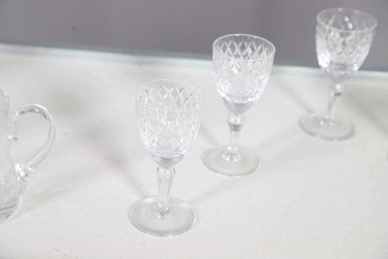 To include eight wine glasses, five port glasses, six sherry glasses, eight tumblers, six cordial glasses and a decanter with jug, H26cm (qty).