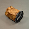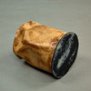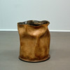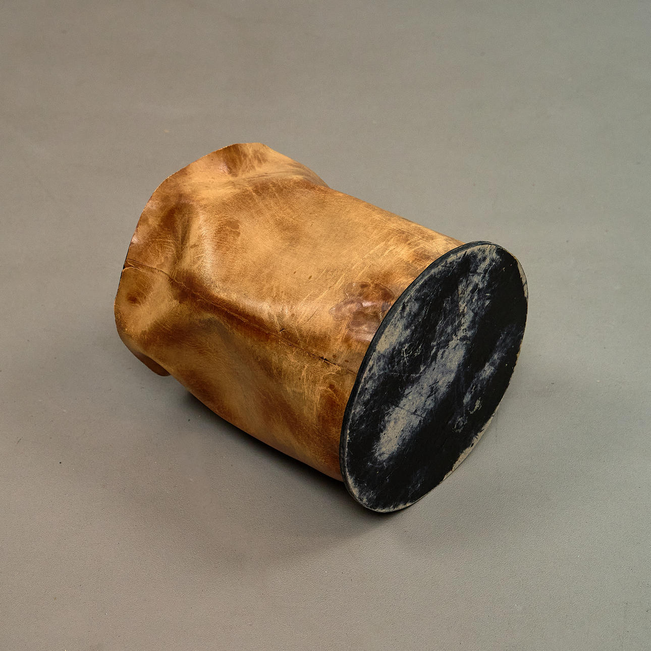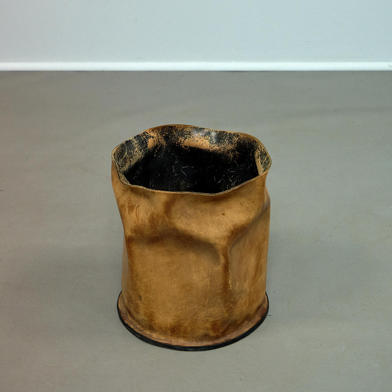 Made from leather Cylindrical shape with softly sculpted, organic surface and irregularly wavy edge. Dark interior.