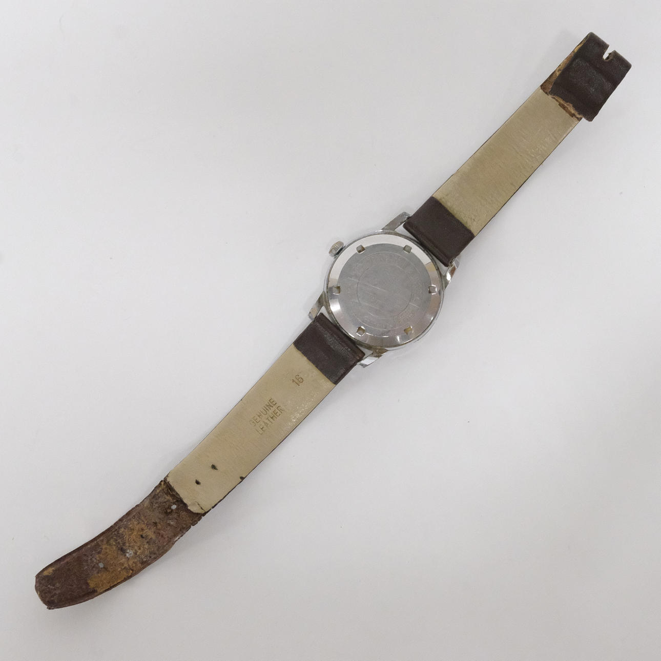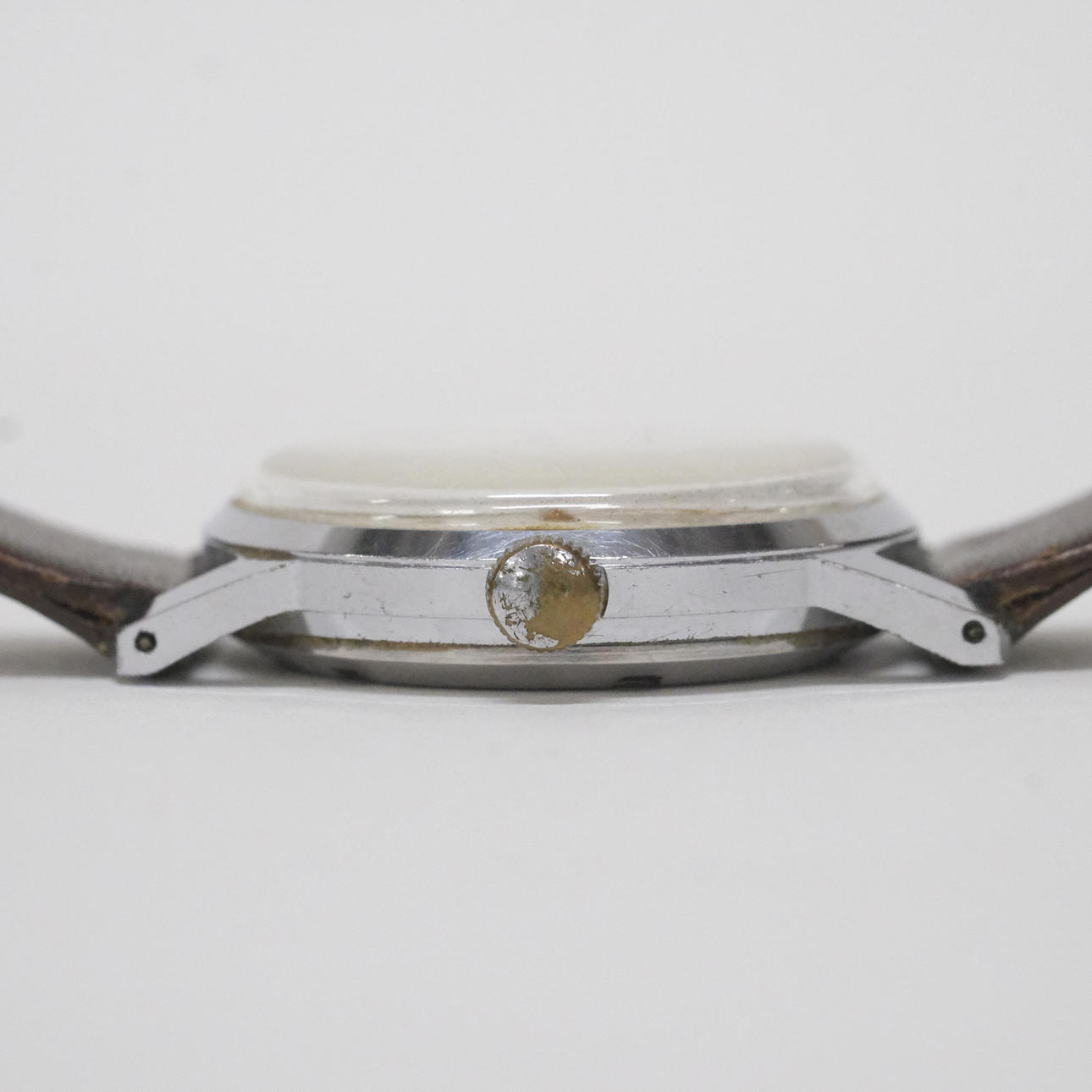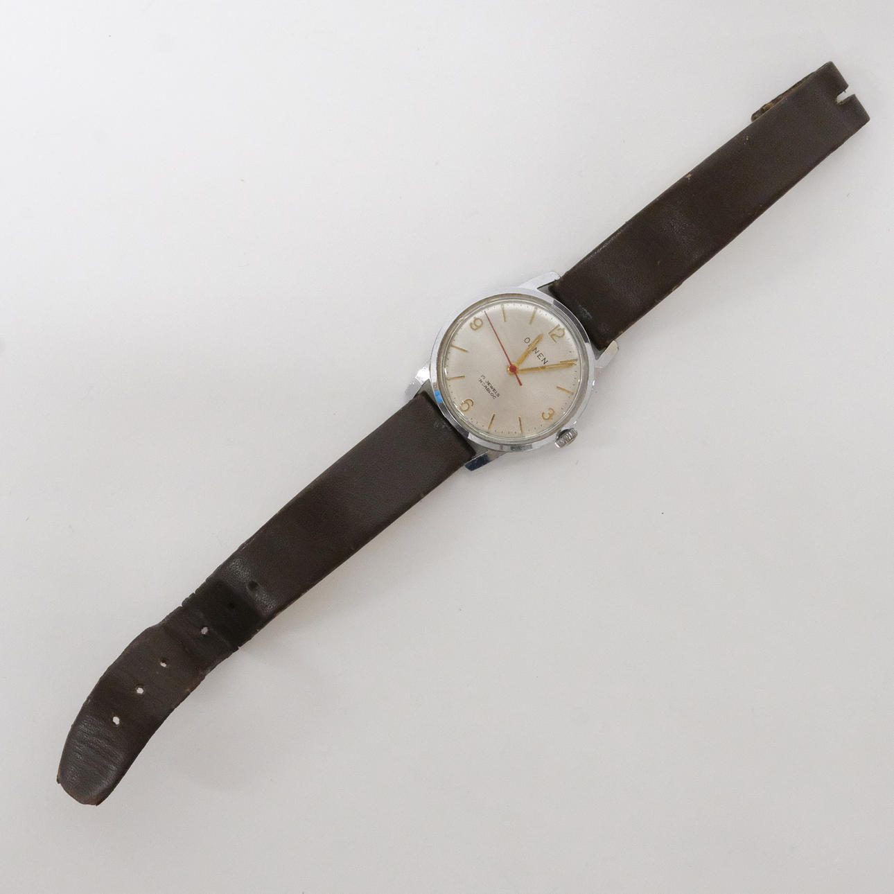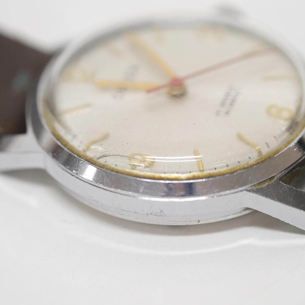 Eagle wristwatch, manual work, diameter 3.2 cm. Glass with small crack, scratches, strap with damage, seems to work.