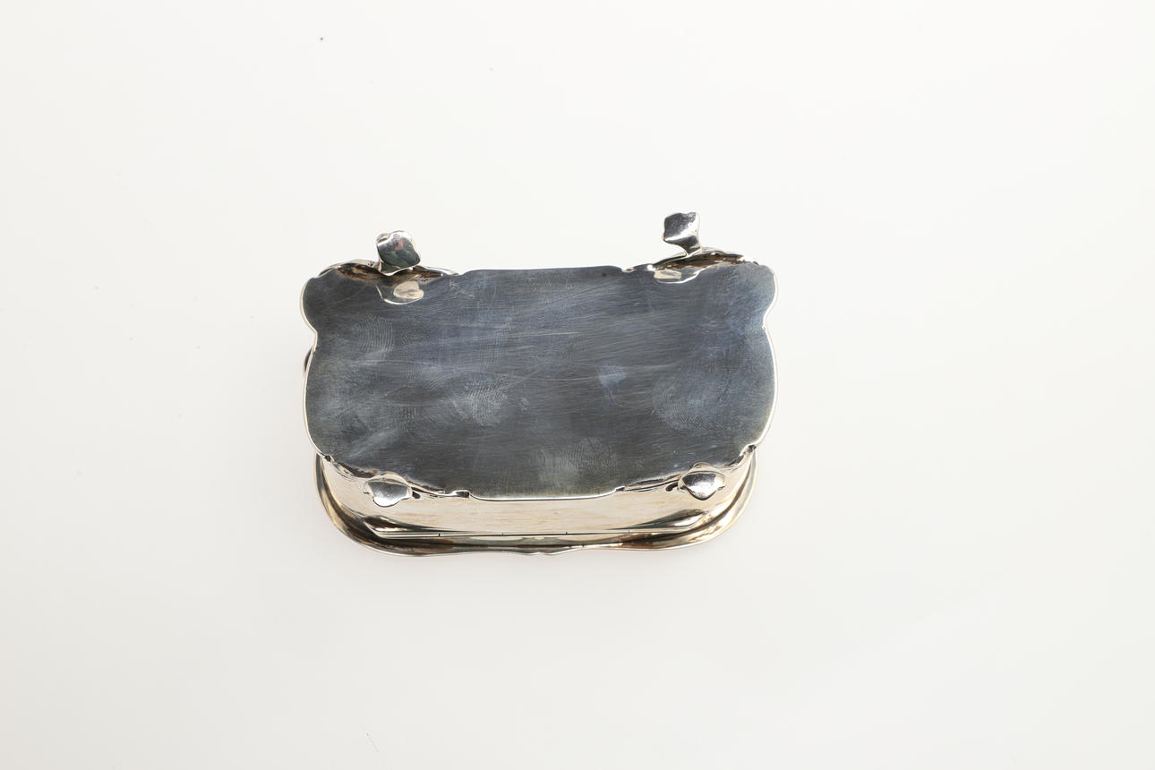 The hinged lid with a cherub design in relief, and supported on pierced feet. Marked for Birmingham 1906 (10.5cms across, 5.5cms high). 4.2ozs.