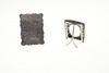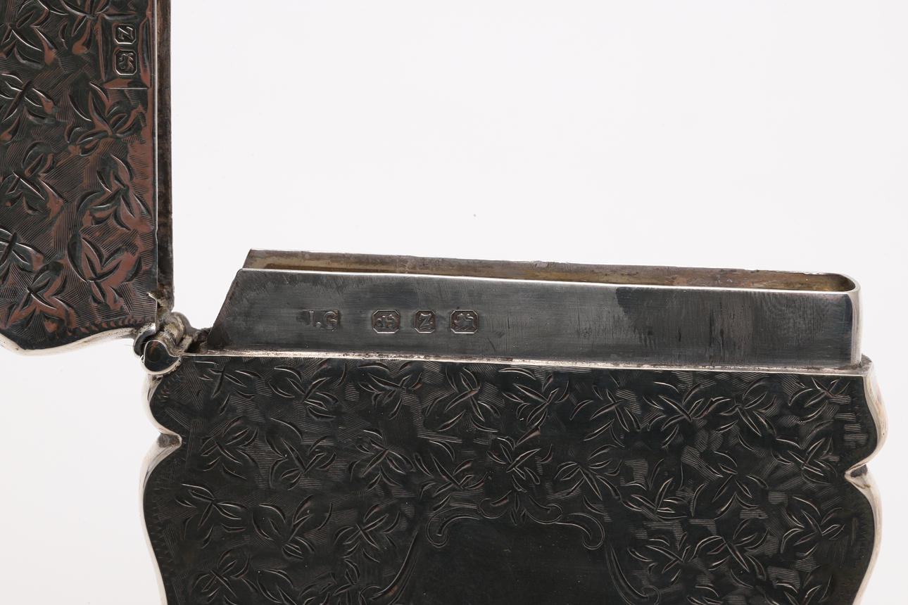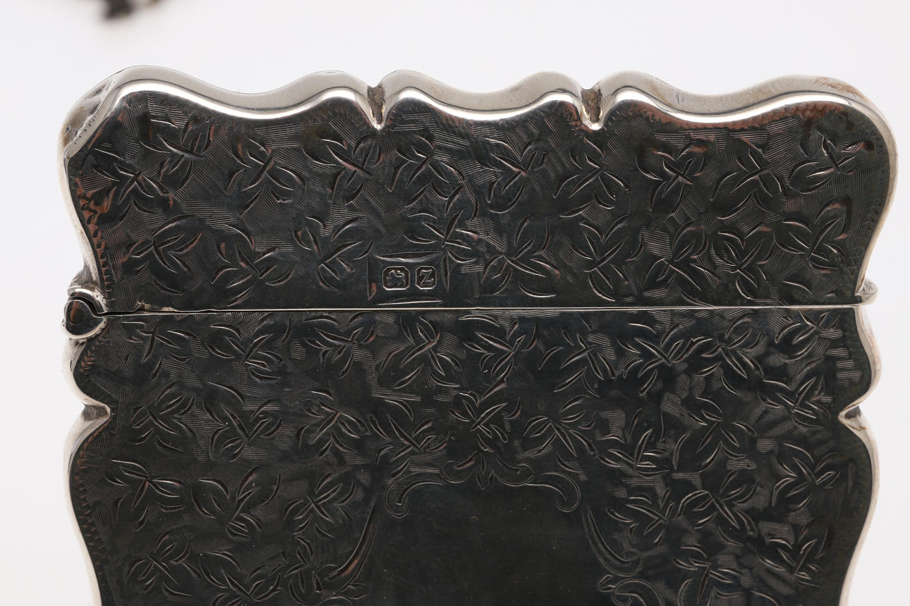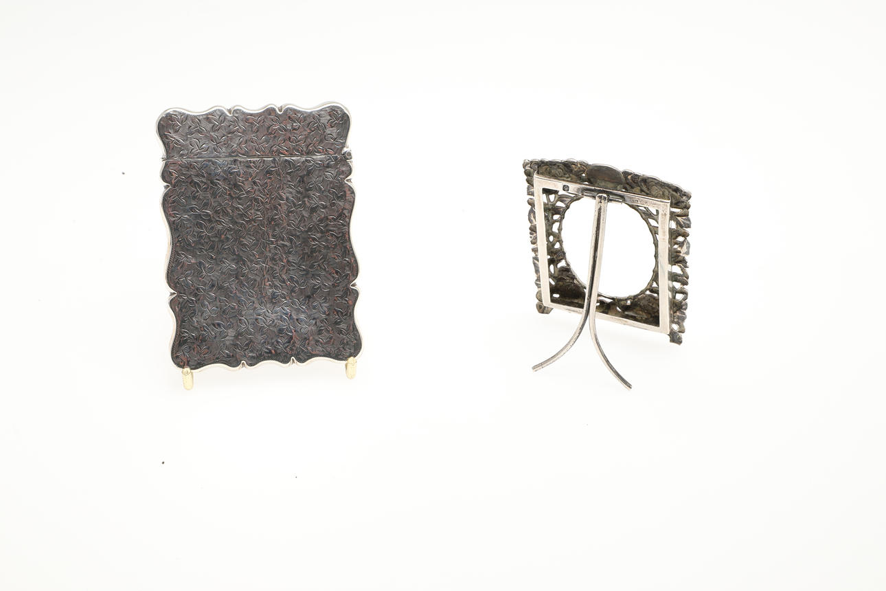 A silver card case, heavily engraved with flowers and foliage, marked for 1899 (9cms high). Also with a small silver photograph frame (possibly Chinese) with foliate design and strut to the reverse (marks to the back, 8cms high). (2). 3.4ozs.
