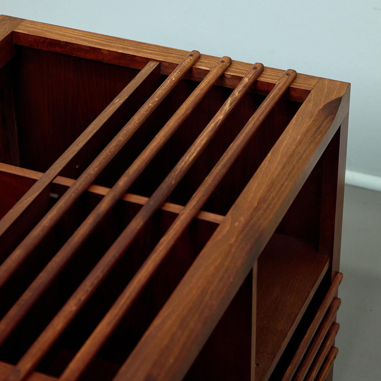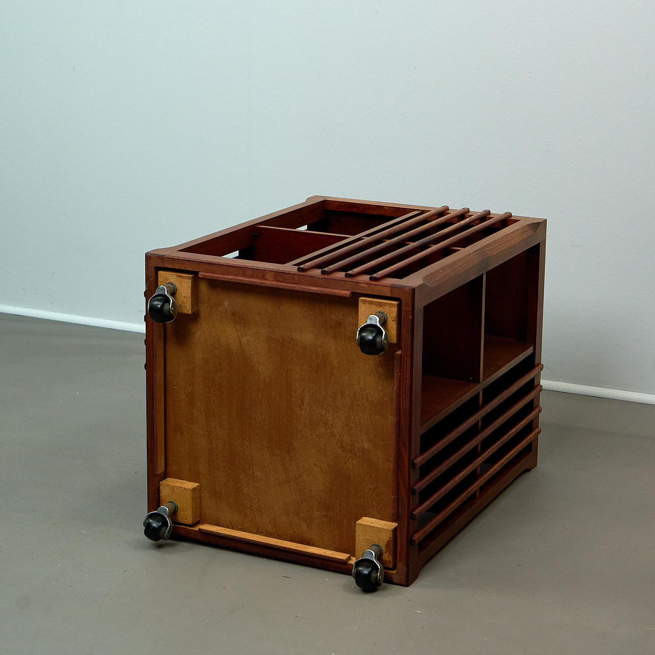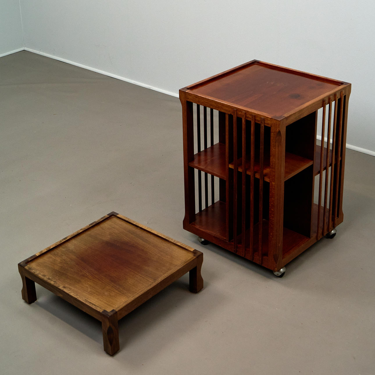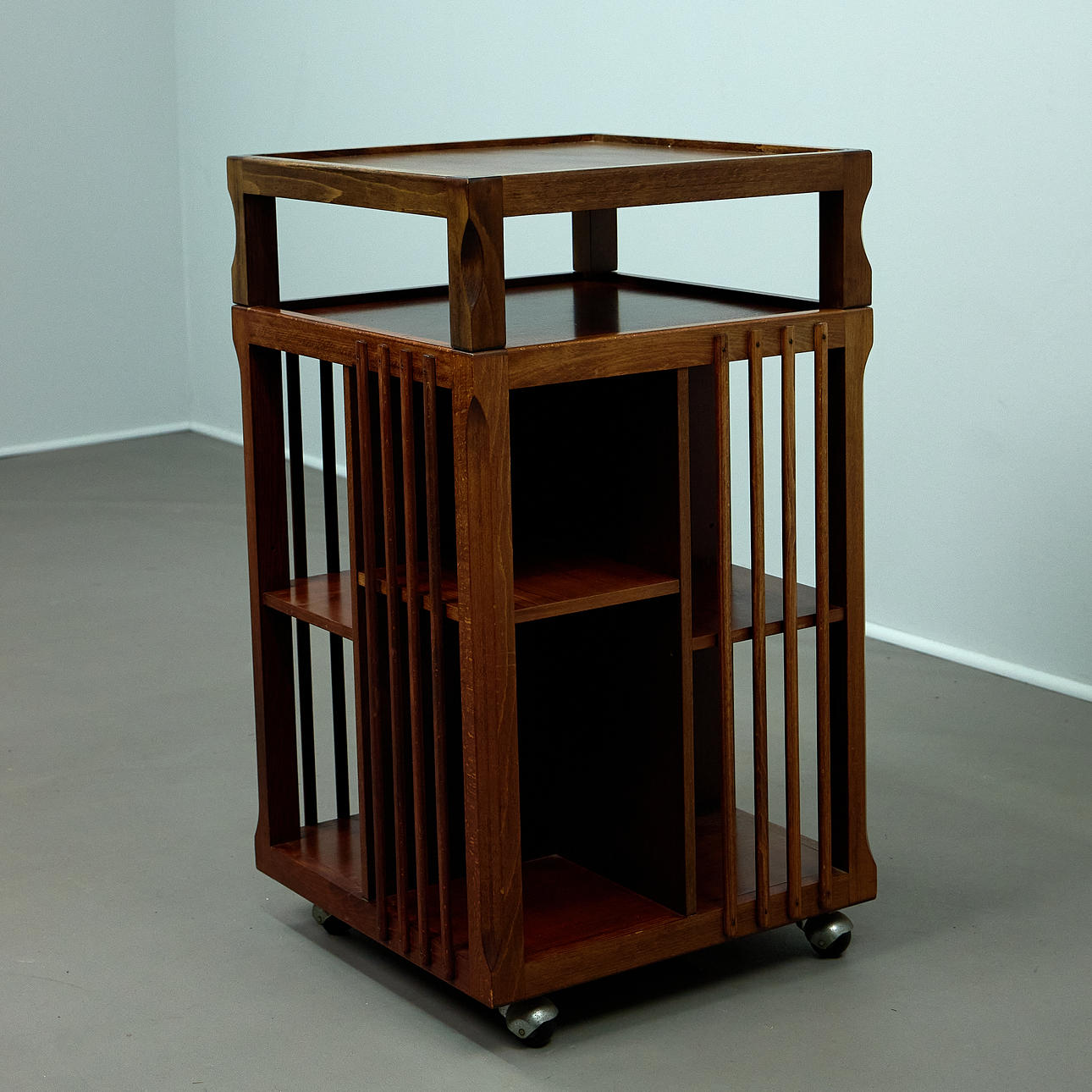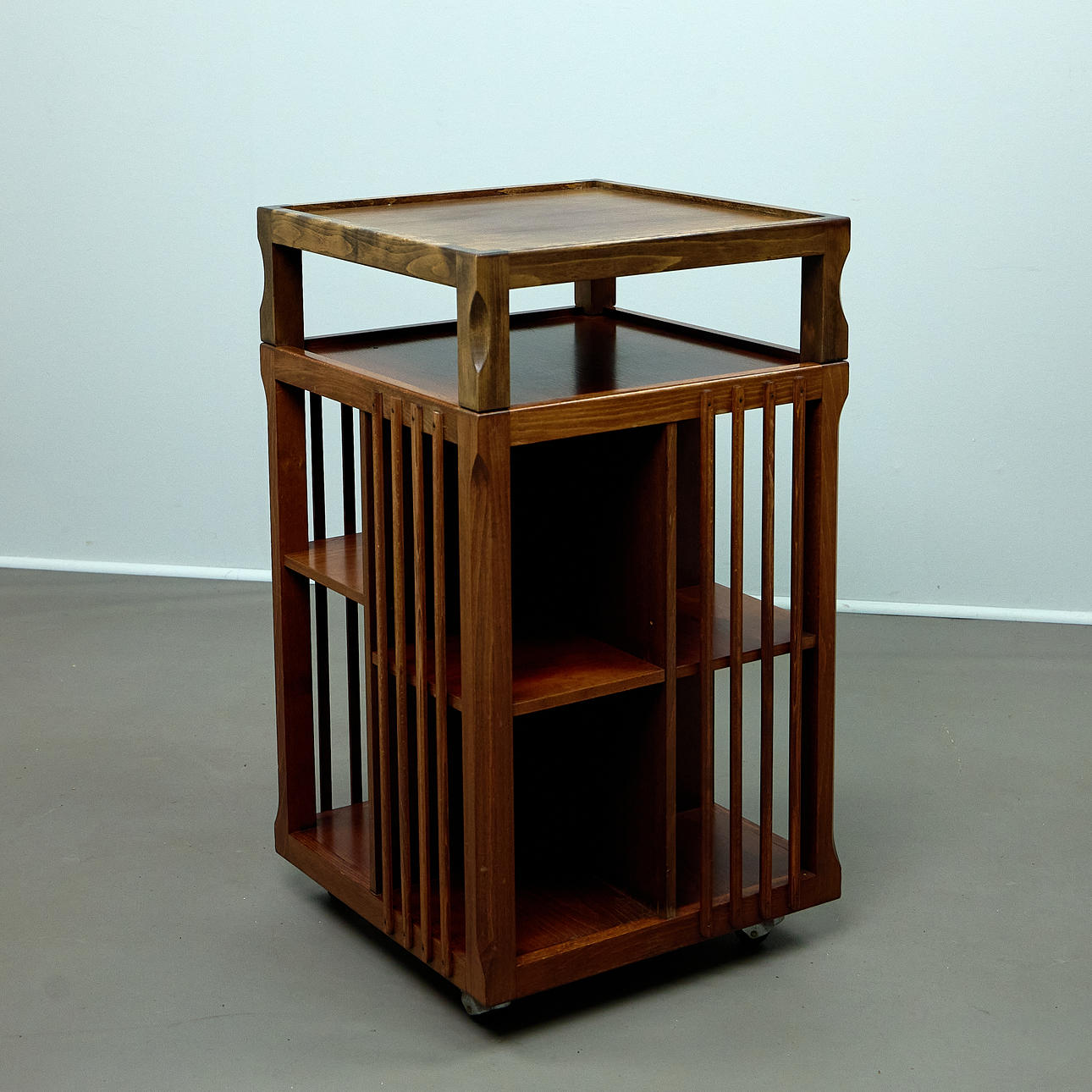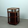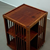 Body made of beech wood, mounted on wheels and rotatable. Open on four sides with vertical struts and several compartments for storing books. Removable tablet attachment