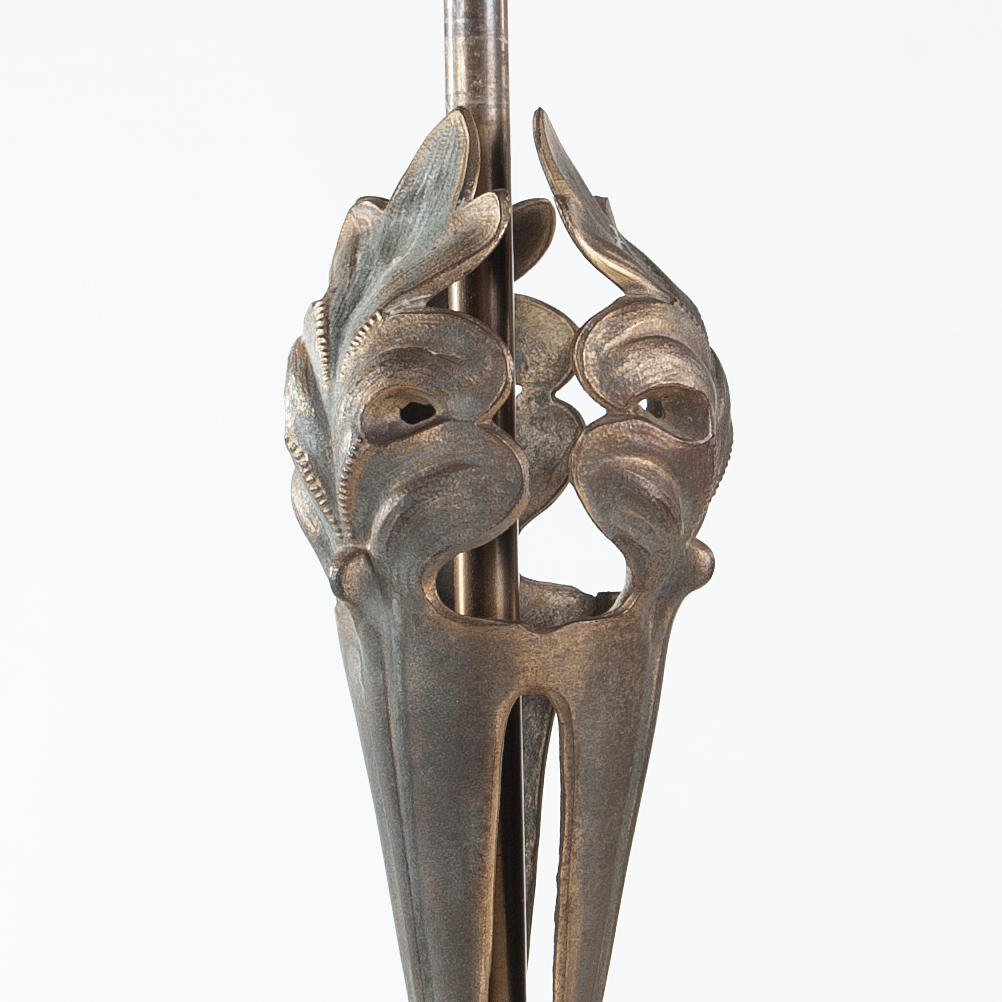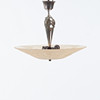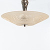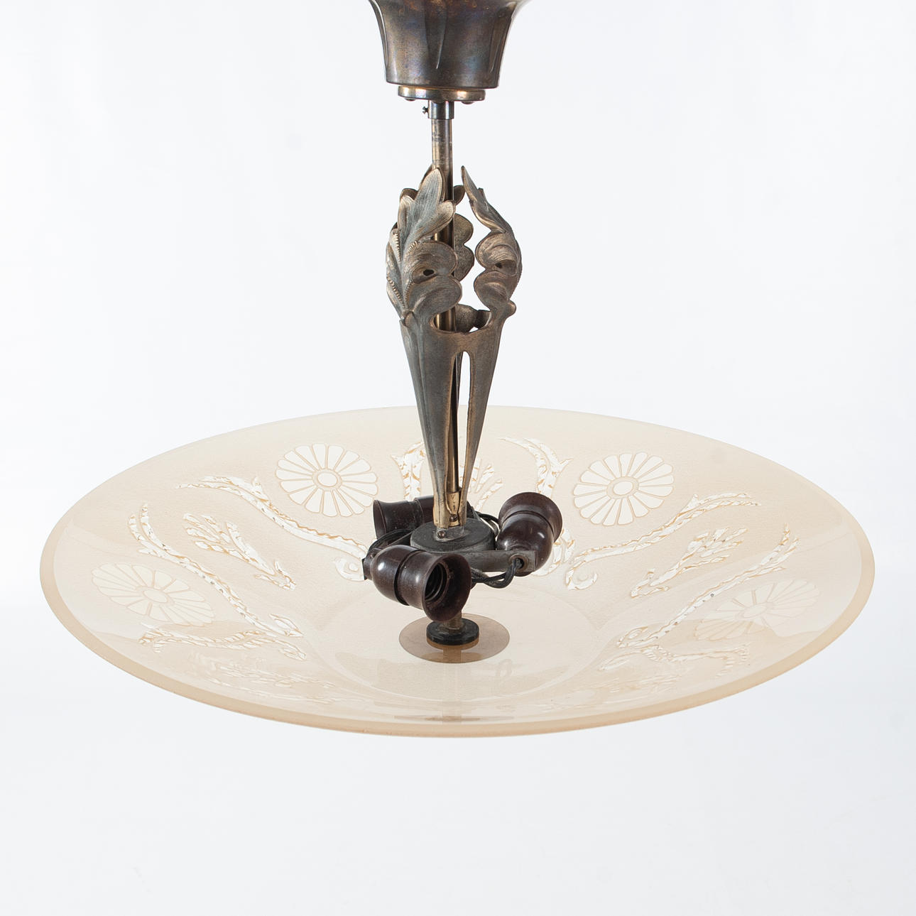 Frame in patinated metal with decorative, sculptural suspension. Dome-shaped screen in pressed glass with etched decor of stylized flowers and loops.